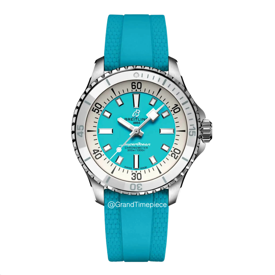 Complementing the visually appealing dial, the Superocean 36 is secured by a vibrant turquoise rubber strap, which not only adds a pop of color but also features a stainless steel folding clasp with a 15mm micro-adjustment system, ensuring a comfortable fit for various wrist sizes. The timepiece is protected by a sapphire crystal, known for its scratch-resistance and clarity. Additionally, a screw-down steel crown enhances the watch’s water resistance, making it waterproof up to 300 meters, which is ideal for diving enthusiasts.