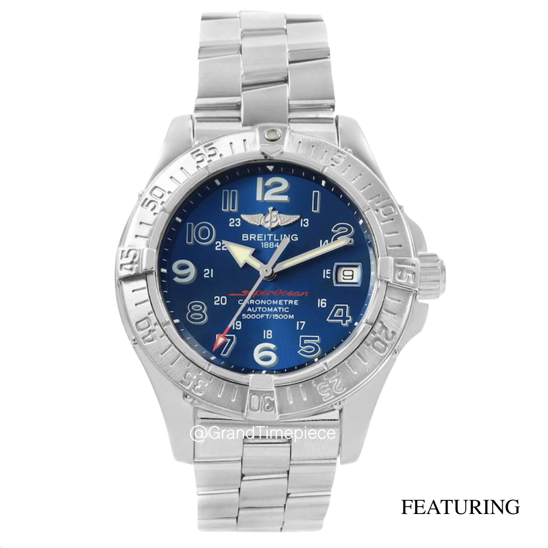Functionality is further enhanced by the stainless steel screwed-down crown, which contributes to the watch’s impressive water resistance of up to 1500 meters, making it suitable for professional diving. The solid steel case back not only provides durability but also reinforces the watch’s water resistance capabilities. At its heart lies the self-winding mechanical movement, Breitling Caliber 17, which boasts a power reserve of 38 to 42 hours, ensuring reliable performance whether worn daily or intermittently. This combination of advanced engineering, stylish design, and practicality makes the Breitling Superocean Steelfish a remarkable timepiece for watch enthusiasts and divers alike.