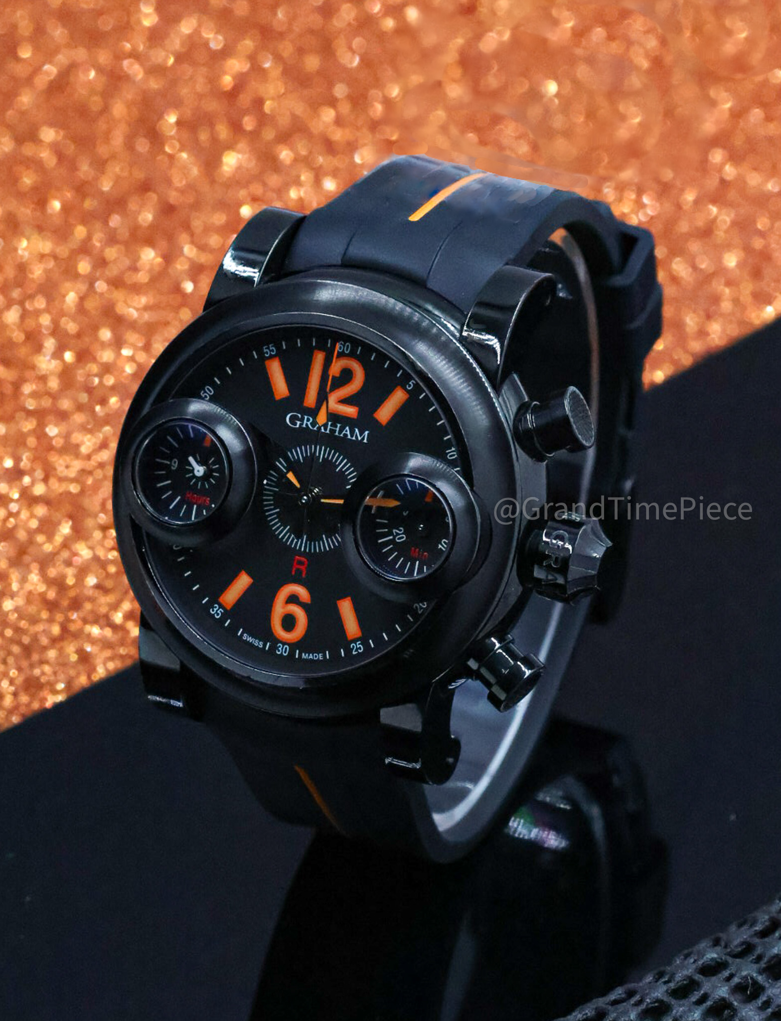 Complementing the watch’s bold design is a comfortable black rubber strap, which not only enhances its sporty look but also provides a secure fit. The combination of high-quality materials and meticulous craftsmanship makes the Graham Swordfish Chronograph a standout piece, merging functionality with a distinctive style that appeals to both watch aficionados and casual wearers.