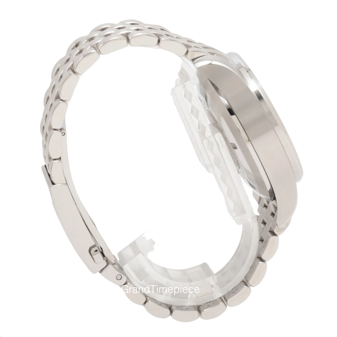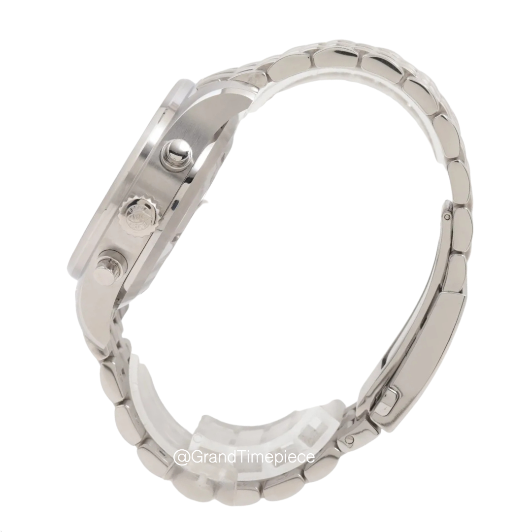 A complementary stainless steel bracelet with a double push-button folding clasp secures the watch on the wrist, ensuring both comfort and reliability. The fixed stainless steel bezel frames the black dial, which is designed for optimal readability. The dial features luminescent white Arabic numeral hour markers and striking diamond-shaped hands that allow for quick and easy time reading, even in low-light conditions. Positioned at the 3 o’clock mark is a convenient double window showcasing both the weekday and date, enhancing the watch’s practicality. The chronograph functionality is highlighted by three subdials: one for running small seconds, one for a 30-minute register, and the last for a 12-hour register, all arranged harmoniously on the dial with an outer stick minute marker track providing additional timing precision.