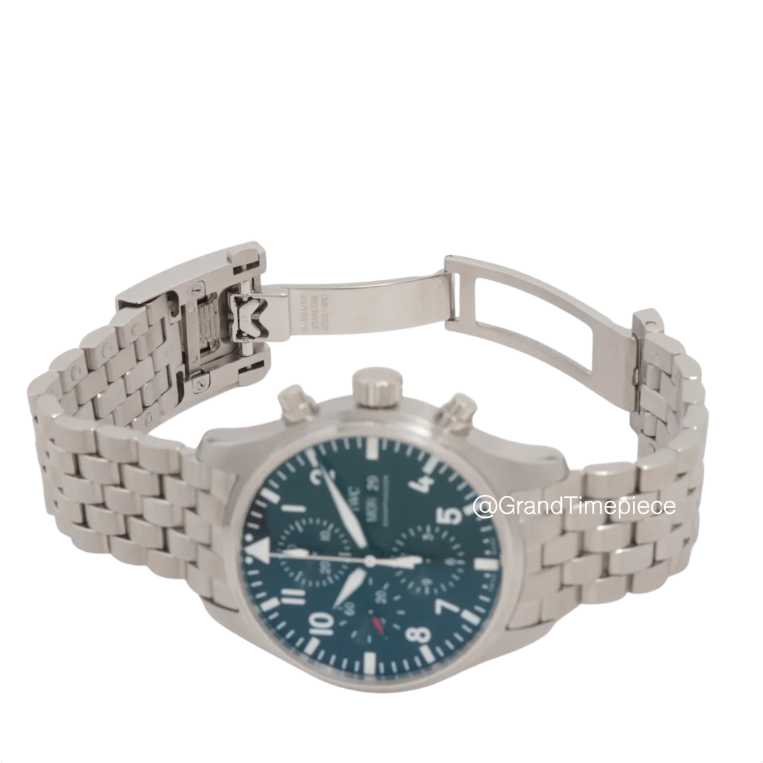 Functions: Hour, Minute, Small Hacking Seconds, Day and Date Display, Glass Secured Against Displacement by Drop in Air Pressure, Soft-Iron Inner Case for Protection Against Magnetic Fields. This IWC Pilot’s Watch Chronograph has been referenced against technical documents and manufacturer records where available to ensure authenticity and a clean history. Immaculate condition with full box and papers. Backed by a 12 month Grand Timepiece warranty. Style: Pilot Model: IW377710. Photos of the actual watch!