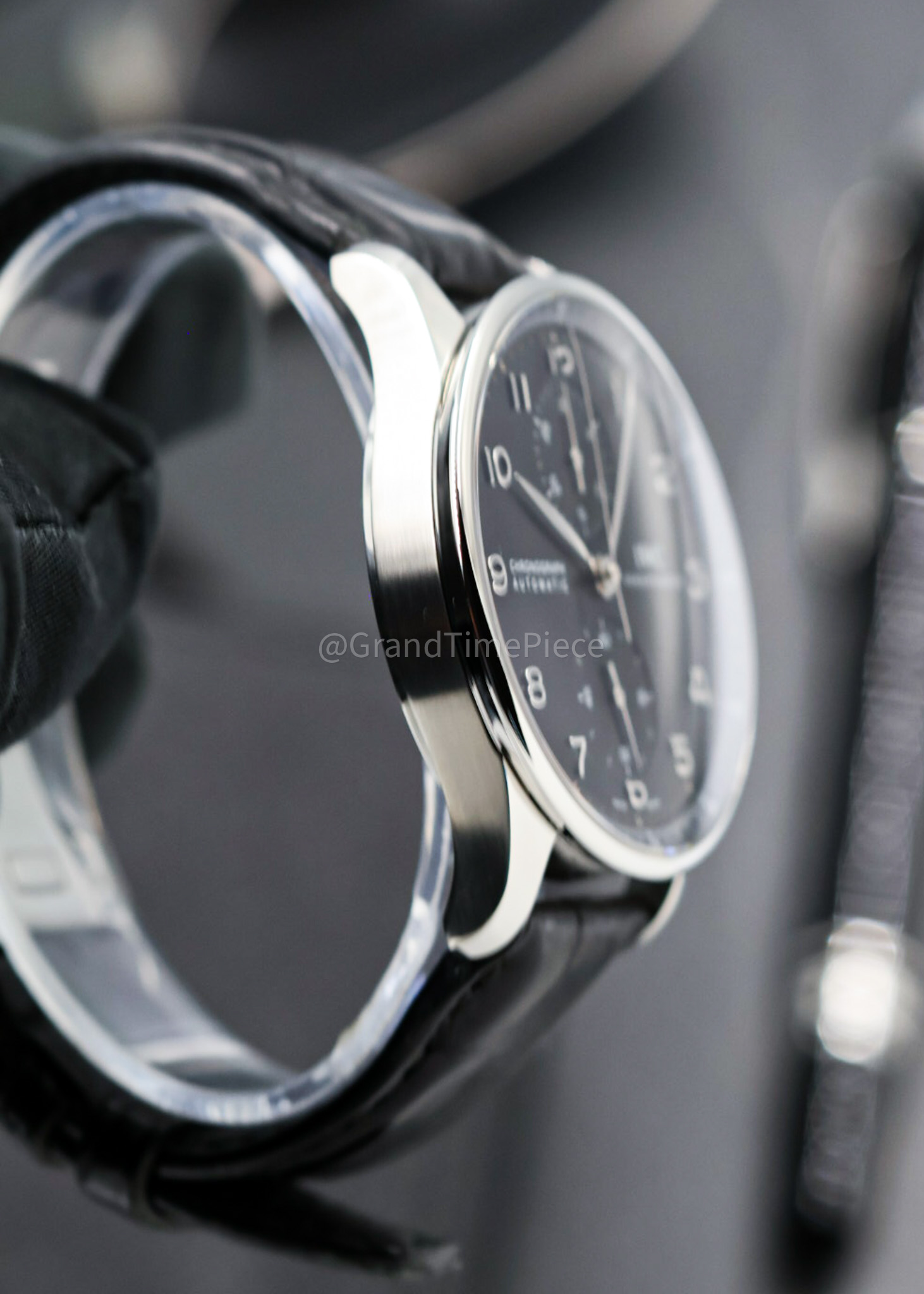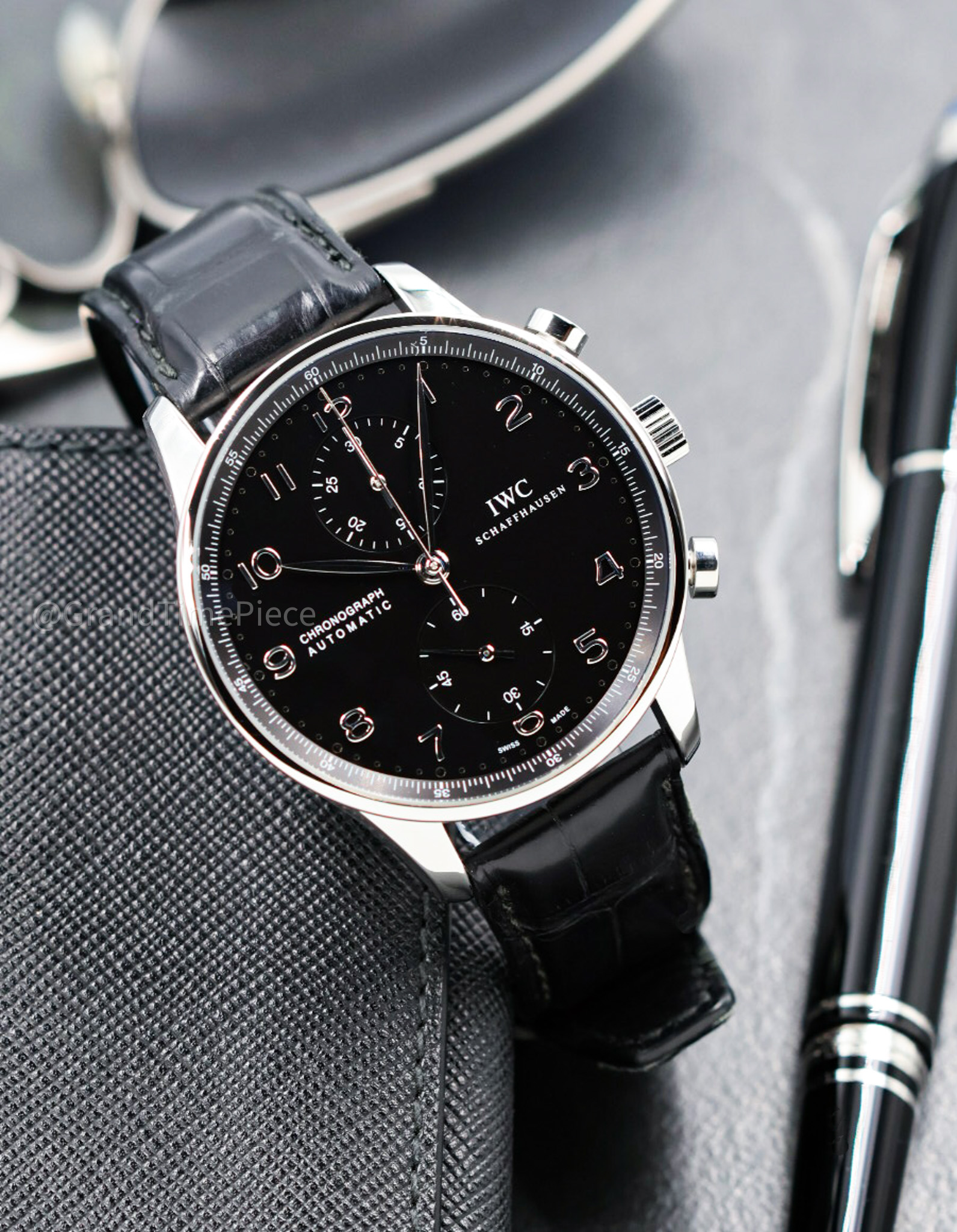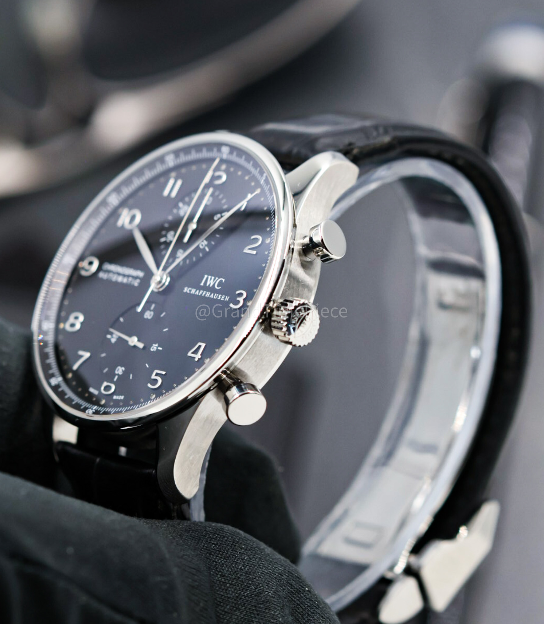 Additionally, the timepiece is protected by convex sapphire glass featuring antireflective coatings on both sides, ensuring clarity and durability. A steel crown accentuates the case, while the solid stainless steel closed case back maintains the watch’s streamlined appearance. This model boasts a self-winding automatic movement, specifically the IWC Calibre 79350, which provides an impressive power reserve of 44 hours, ensuring reliability in timekeeping. With a waterproof rating of up to 30 meters, the IWC Portugieser Chronograph is as practical as it is luxurious, making it an exceptional choice for both everyday wear and special occasions.