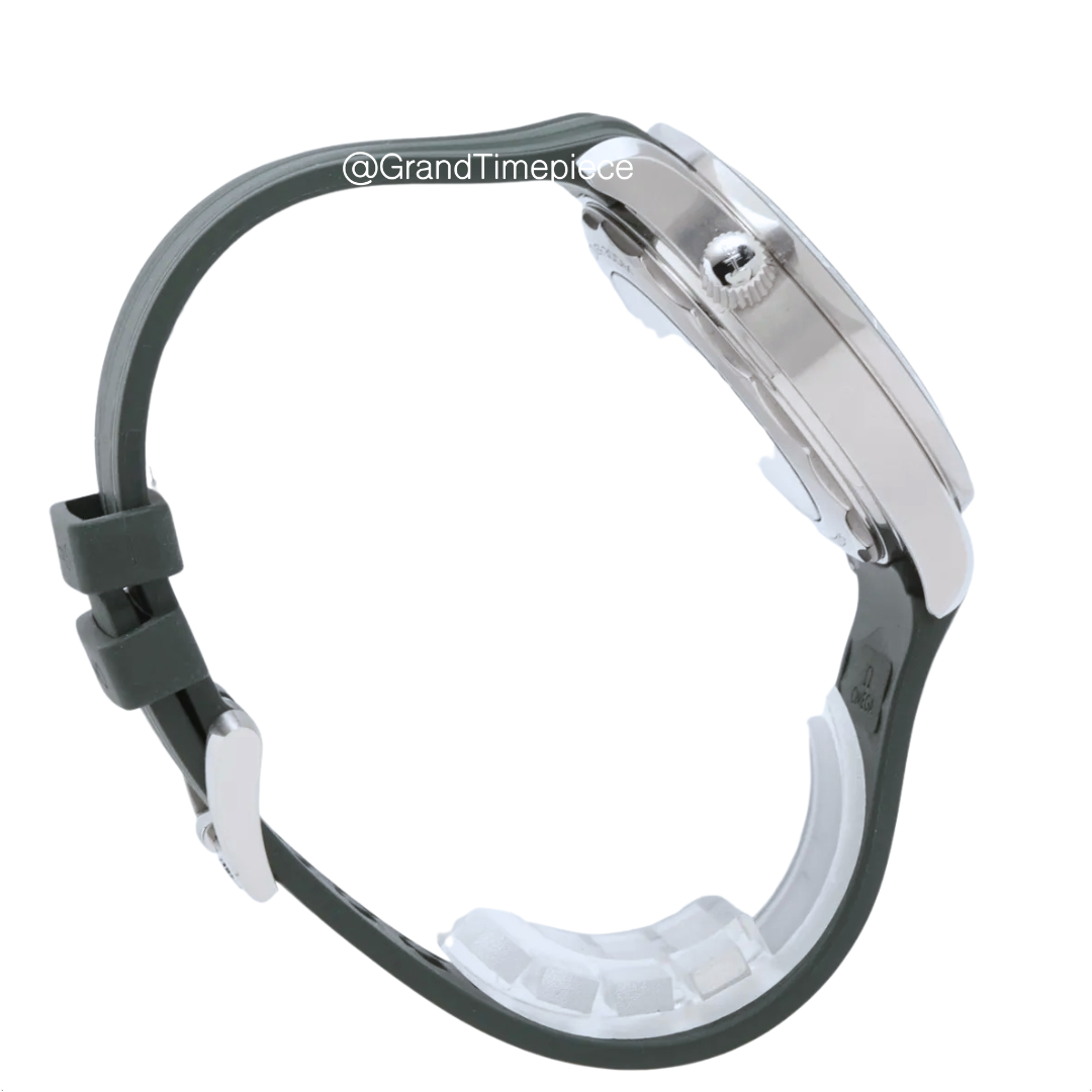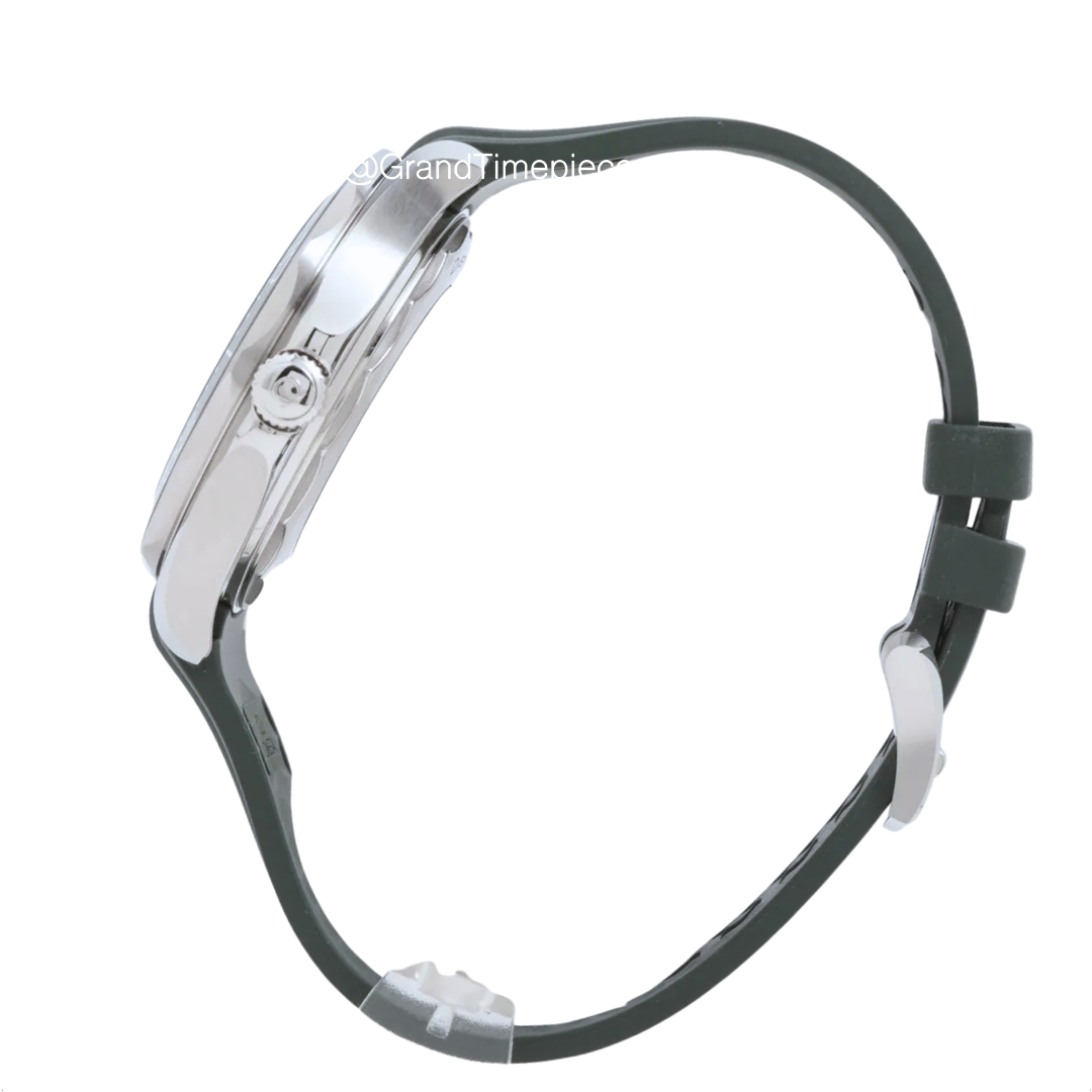 A striking aspect of this model is its green rubber strap, complemented by a stainless steel deployant buckle that not only offers ease of use but also guarantees a secure fit on the wrist. The unidirectional rotating bezel, made from green ceramic, features a contrasting white enamel diving scale that facilitates accurate time tracking for underwater activities. The dial is a captivating PVD chrome green ceramic, adorned with laser-engraved waves that enhance its maritime inspiration. Luminous skeleton hands and dot hour markers provide excellent visibility in low light conditions, while a date window is thoughtfully positioned at the 6 o’clock mark.
