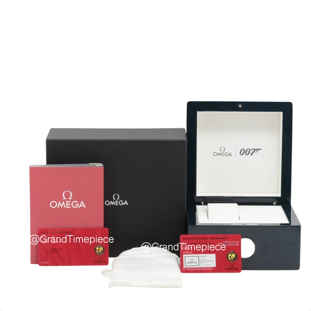 The watch boasts a screw-down crown engraved with the Omega logo, contributing to its waterproof capabilities, rated up to 300 meters depth. The exhibition case back showcases the intricate movements of the watch while proudly displaying the James Bond 60th anniversary emblem, signifying its unique limited edition status. At its core, the Omega Seamaster 300 is powered by a self-winding automatic movement, specifically the Omega caliber 8806. This Co-Axial Escapement movement, known for its precision and reliability, features a rhodium-plated finish and offers a commendable power reserve of 55 hours, ensuring the watch remains functional even when not worn for a couple of days. The combination of exceptional design, advanced technology, and Bond-themed elements make this timepiece a cherished collectible for both watch enthusiasts and fans of the iconic spy.
