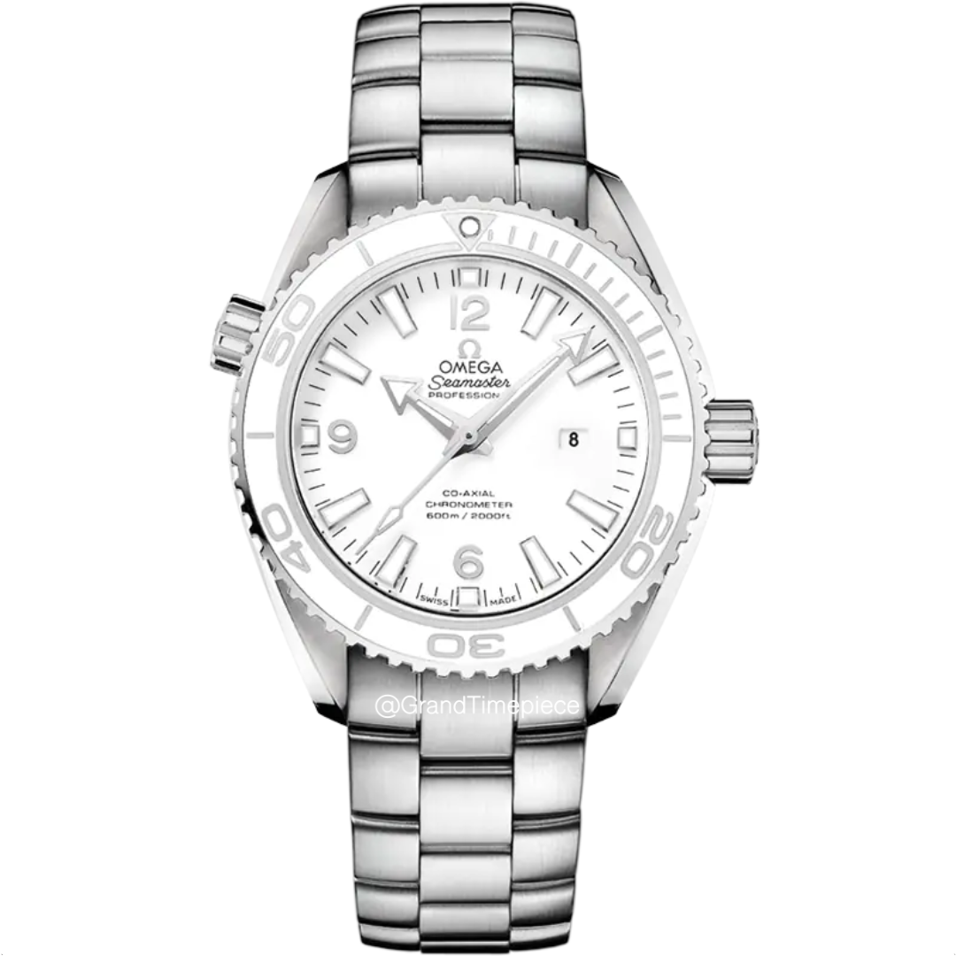 The watch features a striking lacquered white dial, accented with applied polished indices that enhance legibility. An Arabic numeral at 12 o’clock provides a distinctive touch, complemented by a date window positioned at 3 o’clock, making it practical for daily wear. The domed sapphire crystal protects the intricate dial, ensuring clarity and durability. The screw-in stainless steel crown at 3 o’clock, embossed with the iconic Omega logo, is reinforced with integrated guards to maintain the impressive water resistance of up to 600 meters. This depth rating makes it an ideal companion for professional divers and water sports enthusiasts alike.