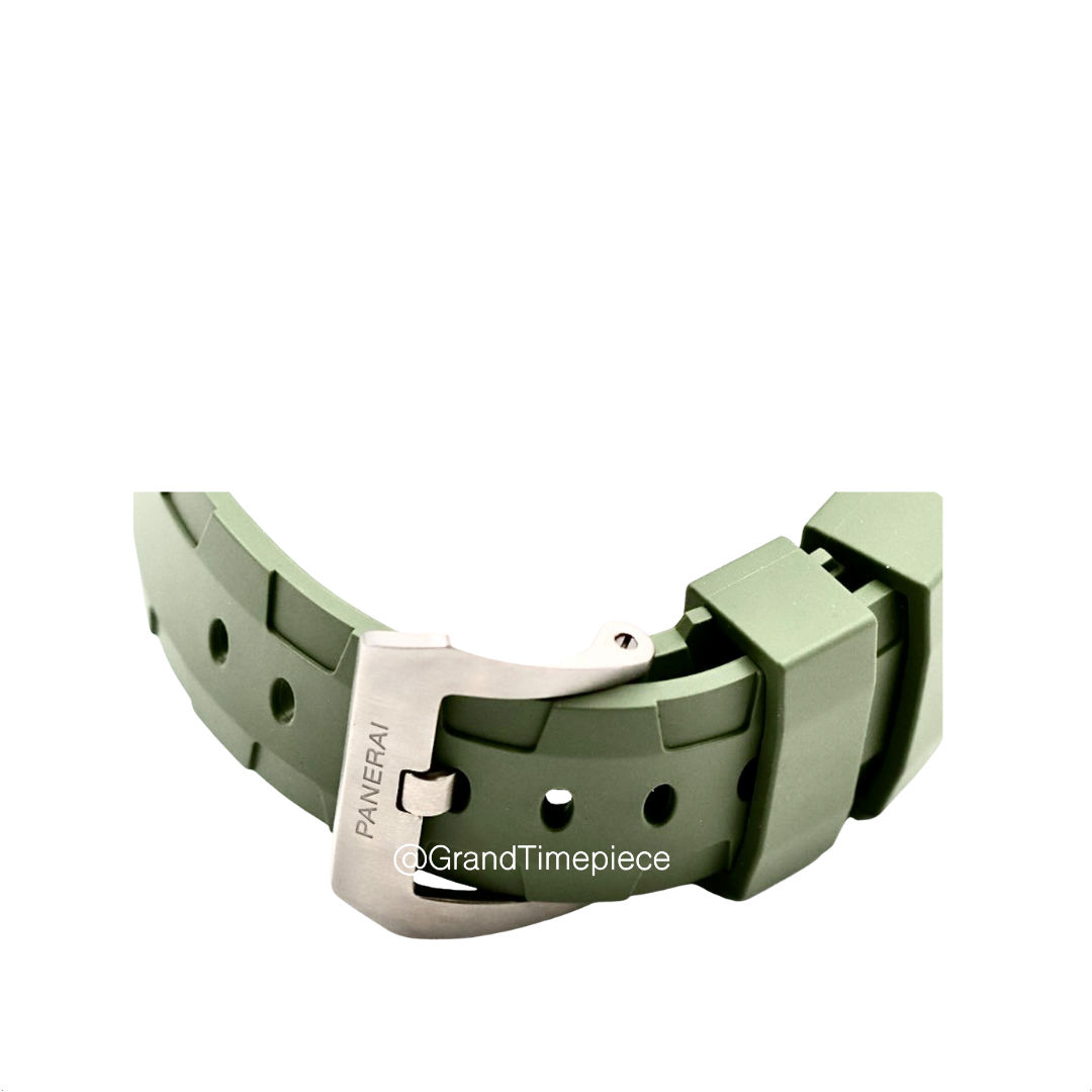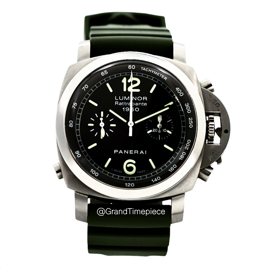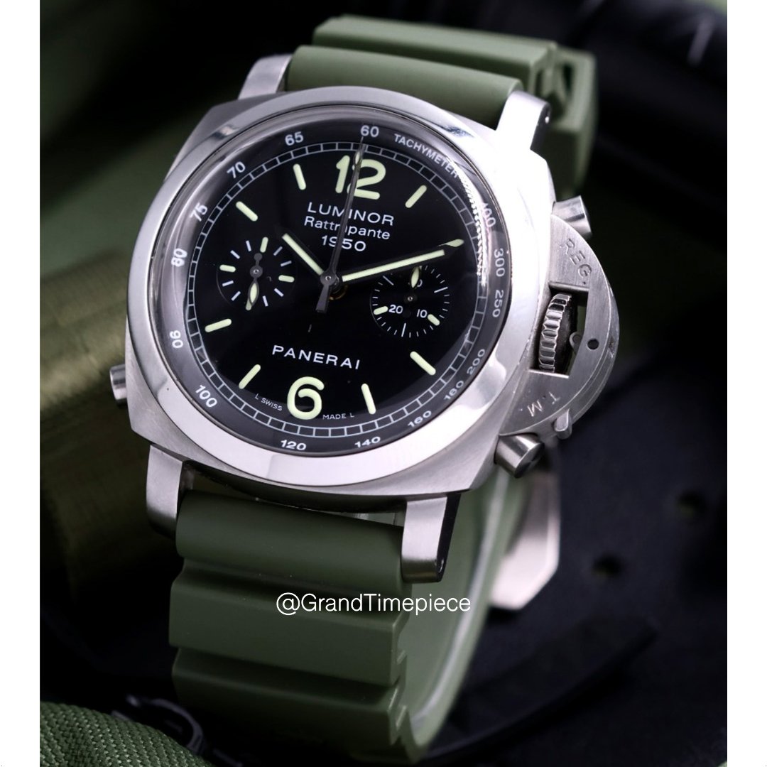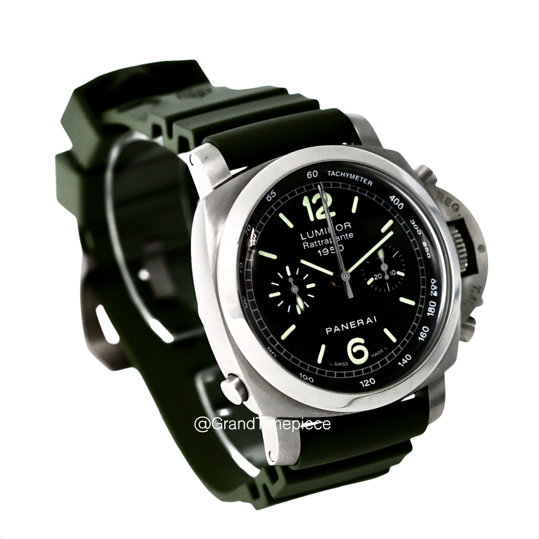 The Panerai Luminor 1950 Rattrapante (Model PAM00213) is an exquisite timepiece that embodies both sophisticated engineering and classic design. Housed within a polished stainless steel cushion-shaped case, the watch measures an impressive 44mm in diameter, complemented by a fixed stainless steel bezel that enhances its robust aesthetic. The timepiece offers versatility with a green rubber strap paired with a black leather option, allowing wearers to adapt their style for various occasions.