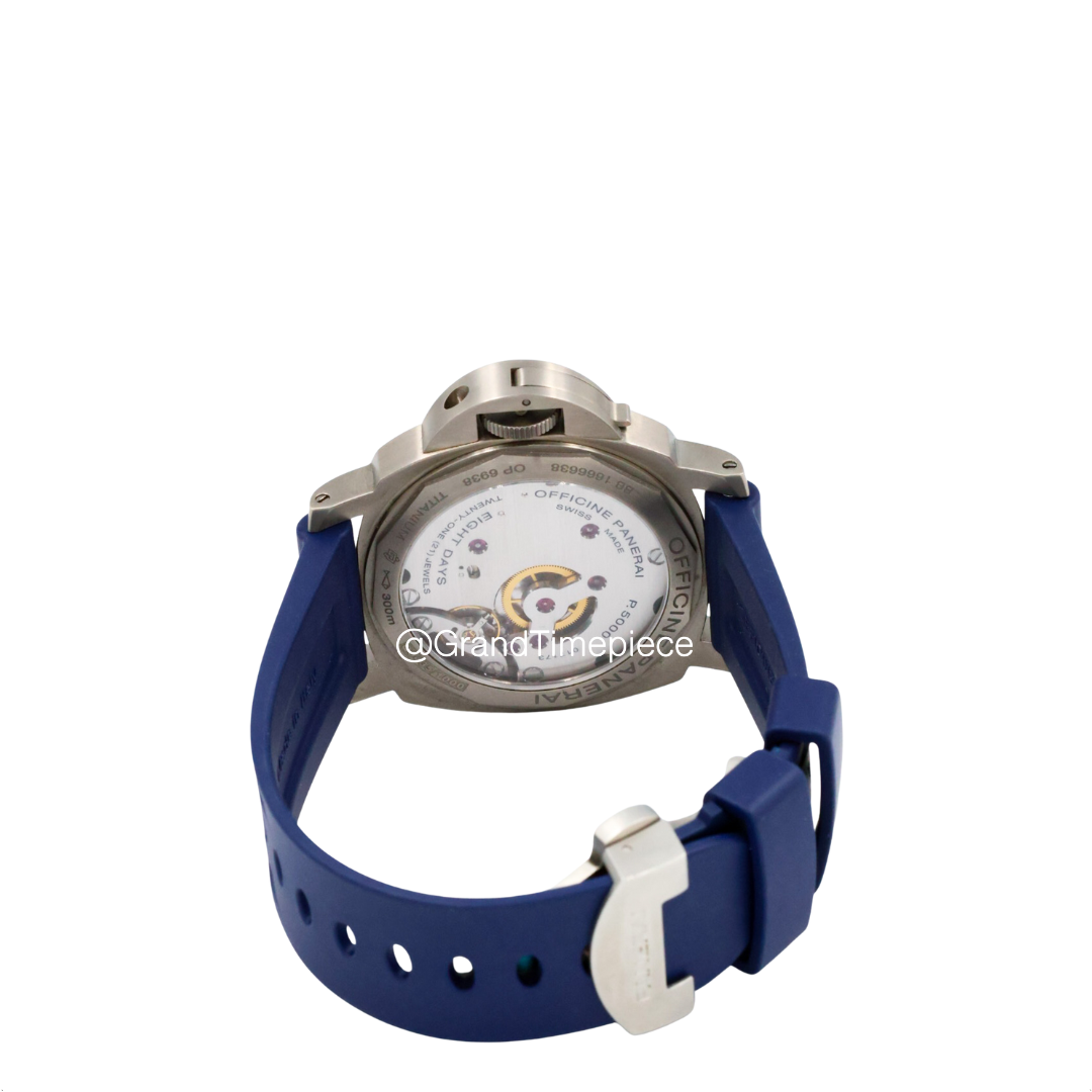 The PAM00562 is completed with a striking blue rubber strap, which not only provides a modern contrast to the brushed titanium but also ensures comfort on the wrist. The polished steel folding clasp adds an element of sophistication, allowing for easy adjustments and a secure fit. The combination of robust materials, functional features, and exquisite design details makes the Panerai Luminor Base 8-Days an exceptional choice for watch enthusiasts and everyday users alike, blending style, performance, and durability in a truly remarkable timepiece.