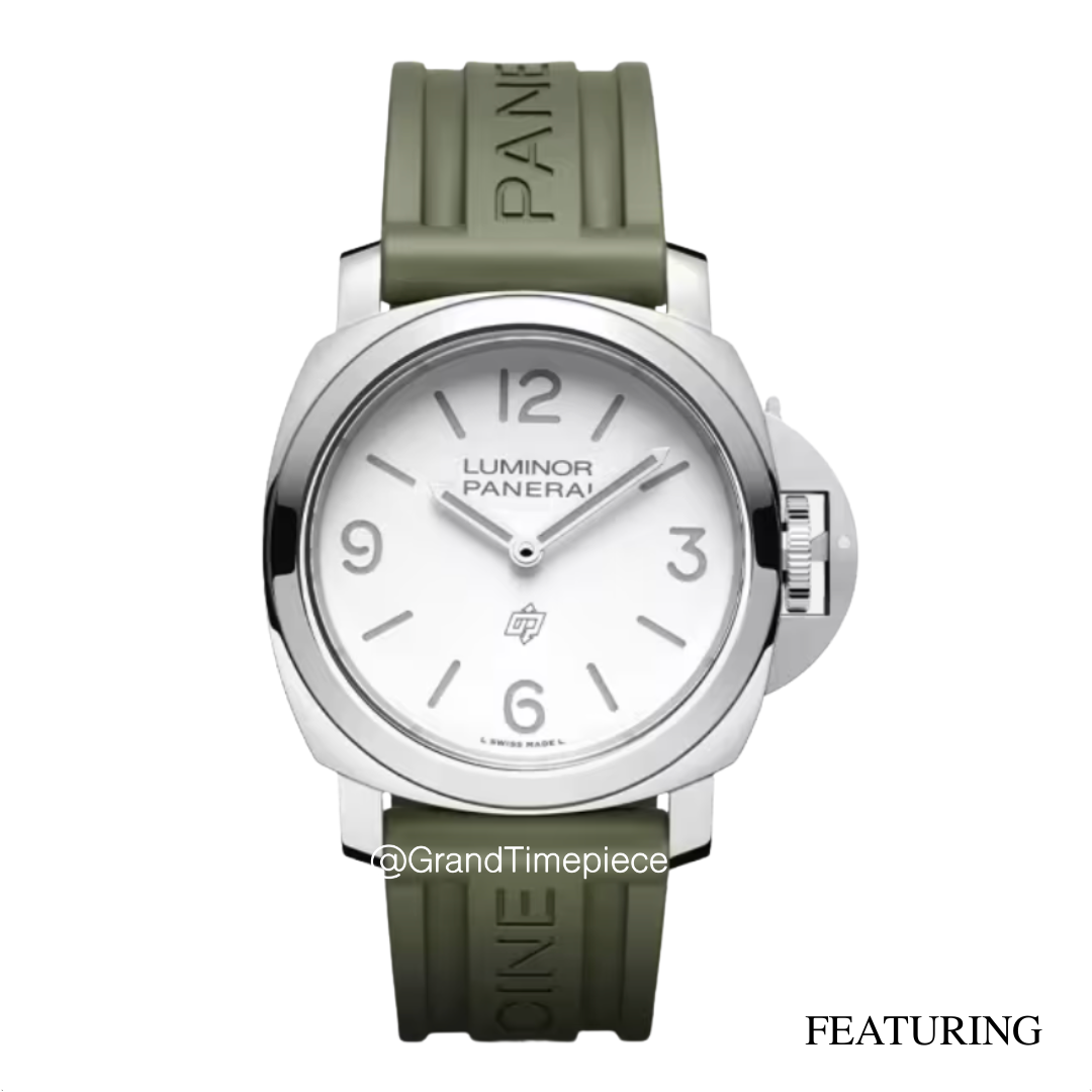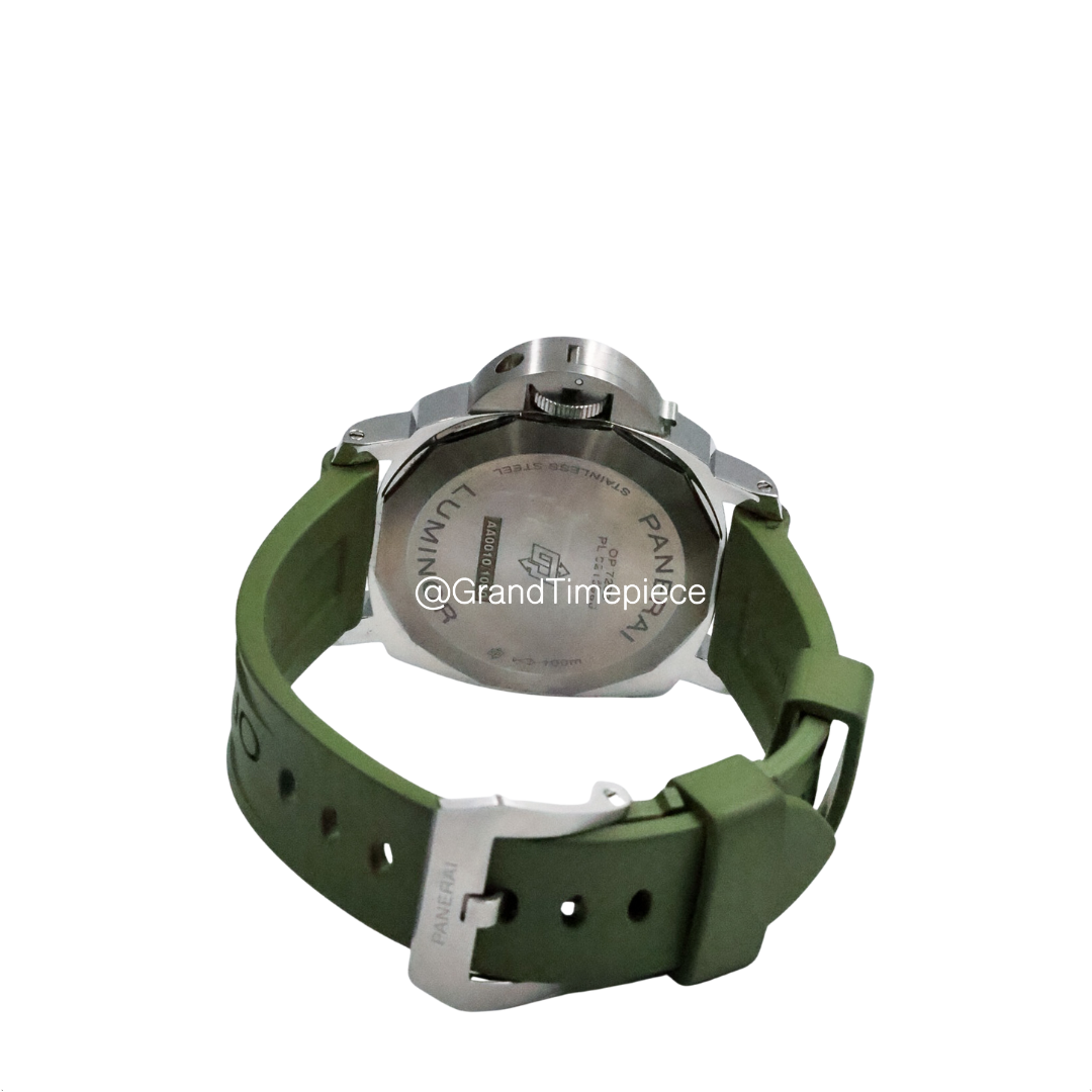 Complementing the case is the vibrant green rubber strap crafted by Panerai, which serves both functional and aesthetic purposes. This strap offers unmatched comfort and flexibility, ensuring that the watch can be worn for extended periods without discomfort. The choice of green is particularly appealing, reflecting a modern, sporty vibe while also paying homage to Panerai’s maritime roots. The fixed stainless steel bezel adds an extra layer of sturdiness, framed beautifully by the domed sapphire crystal that not only enhances visual clarity but also protects the dial from scratches and environmental elements.