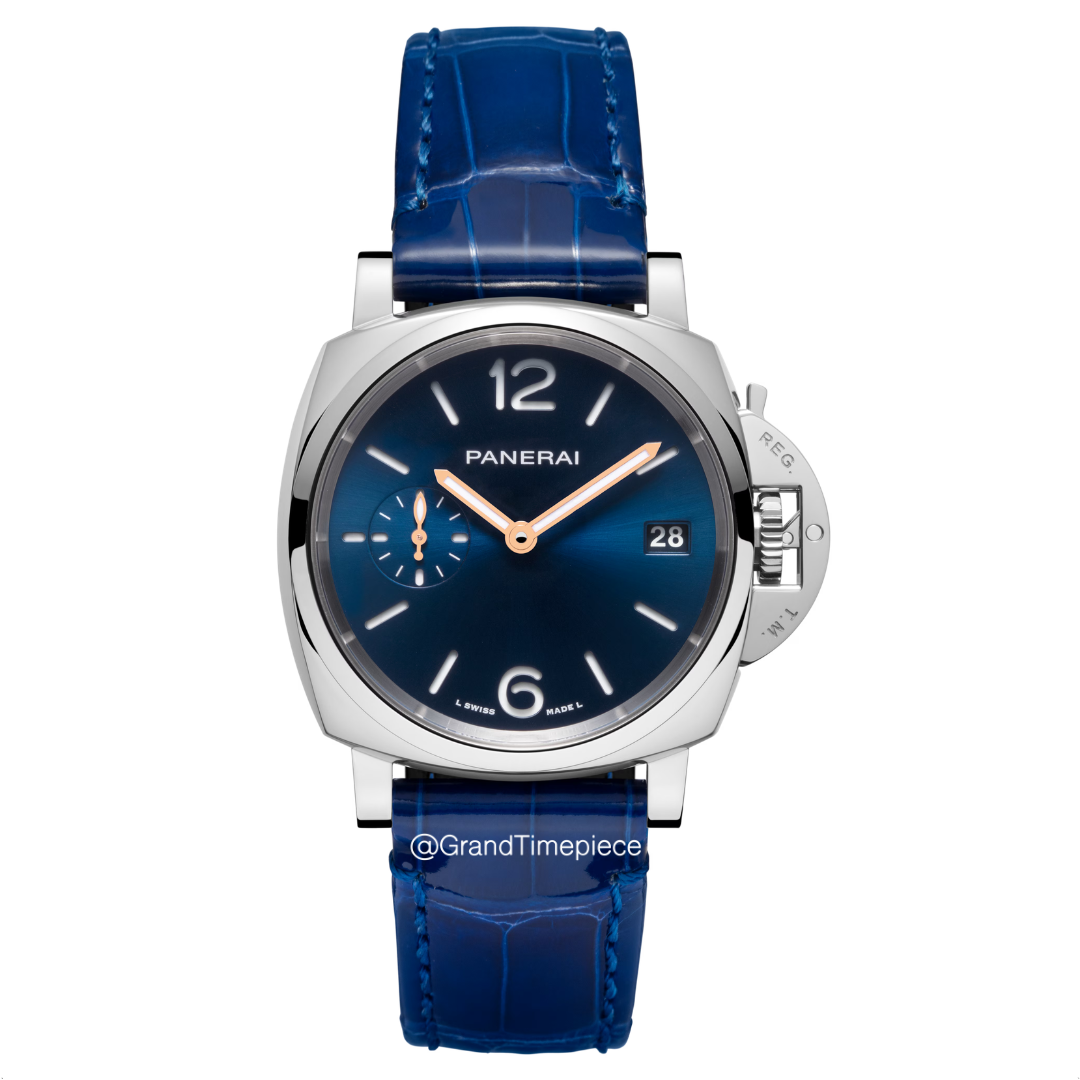 The Panerai Luminor Due model PAM01273 is an embodiment of sophistication and innovation in watchmaking, featuring a distinct cushion-shaped case crafted from stainless steel. With a diameter of 38mm, the case strikes a perfect balance between presence and comfort on the wrist. It is complemented by a fixed stainless steel bezel, contributing to its sleek and robust aesthetic. One of the signature elements of this model is the blue crocodile-patterned leather strap, designed with a new quick-release system by Panerai, allowing for easy interchangeability and customization.