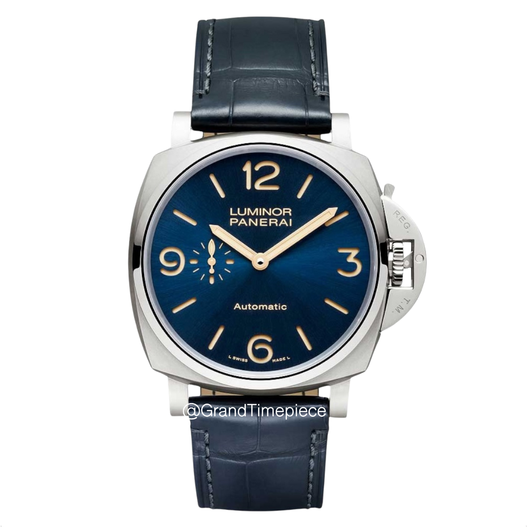 The Panerai Luminor Due model PAM00729 is a striking timepiece that showcases the perfect blend of durability and elegance, tailored for those who appreciate both functionality and refined aesthetics. The watch is crafted with a cushion-shaped case made from lightweight yet sturdy titanium, boasting a diameter of 45.0 mm that provides a substantial presence on the wrist while offering remarkable comfort during wear. Complementing the case, a vivid blue leather strap with a titanium tang-buckle secures the watch firmly, enhancing its stylish appearance and ensuring ease of use.