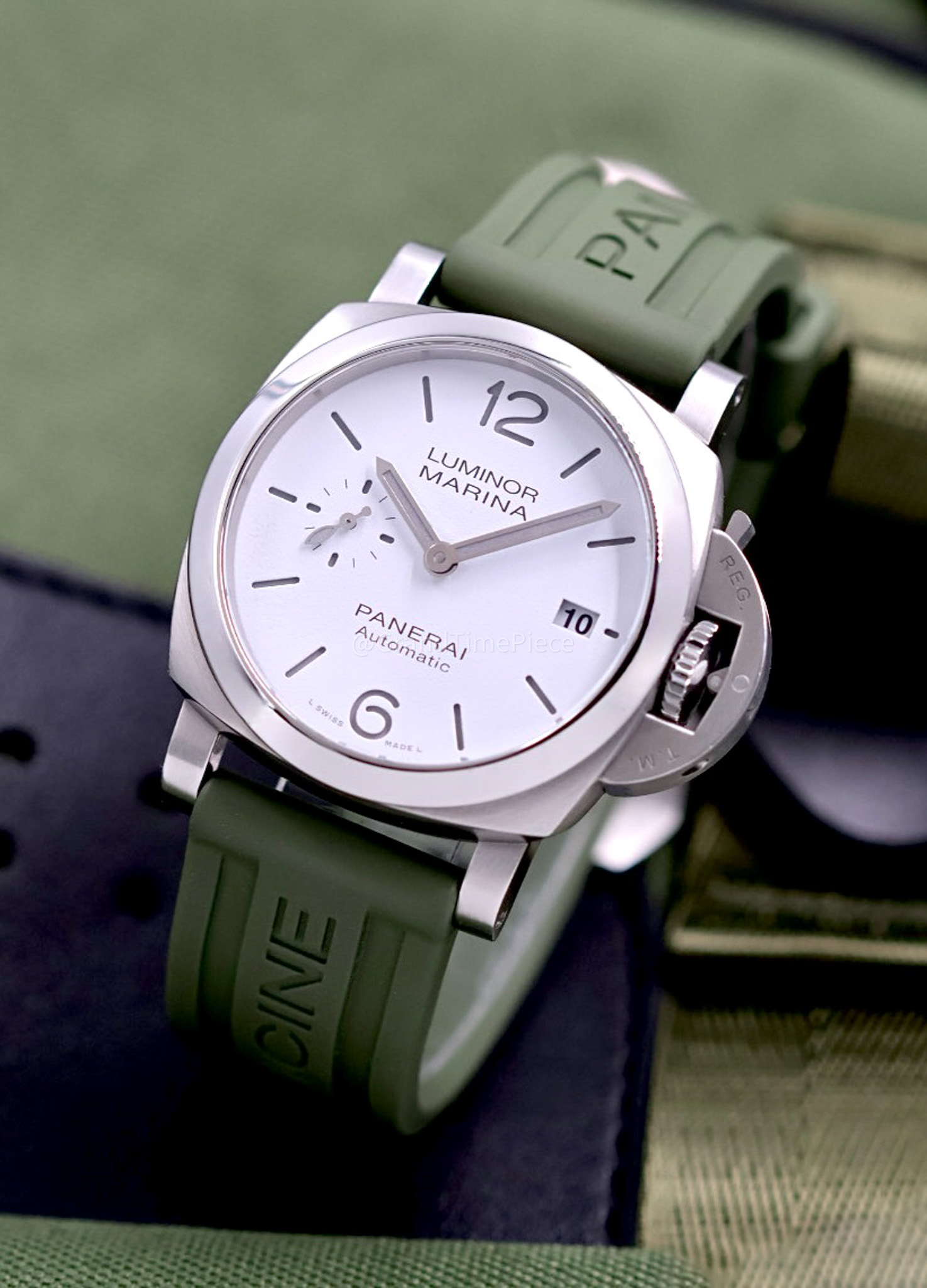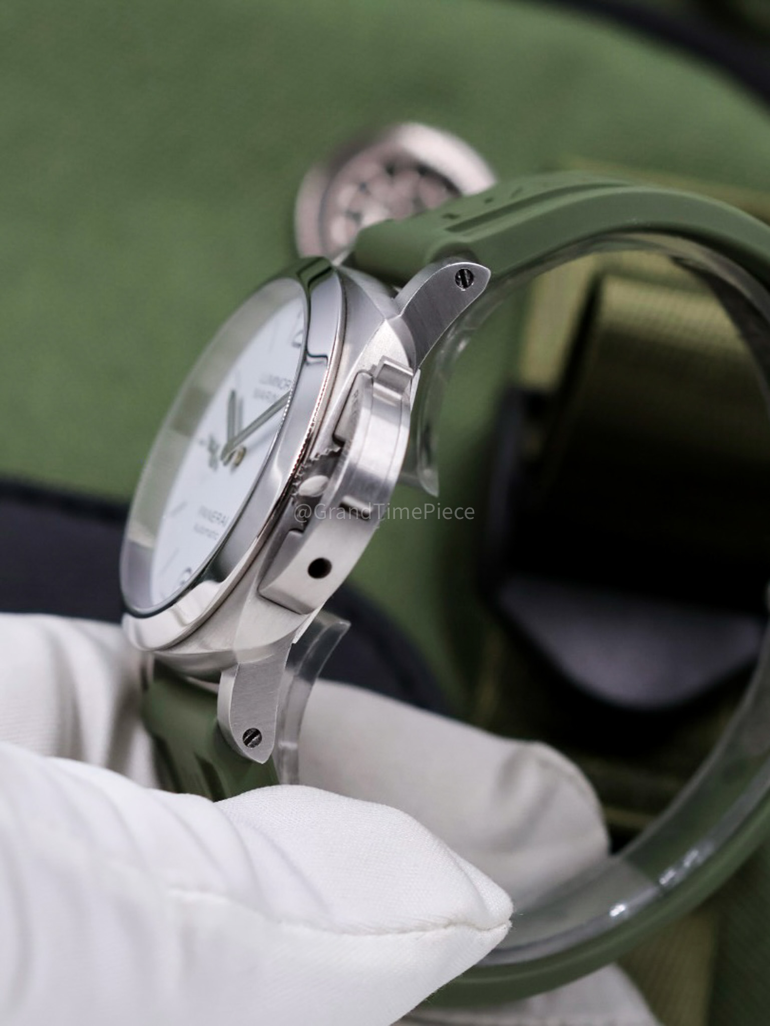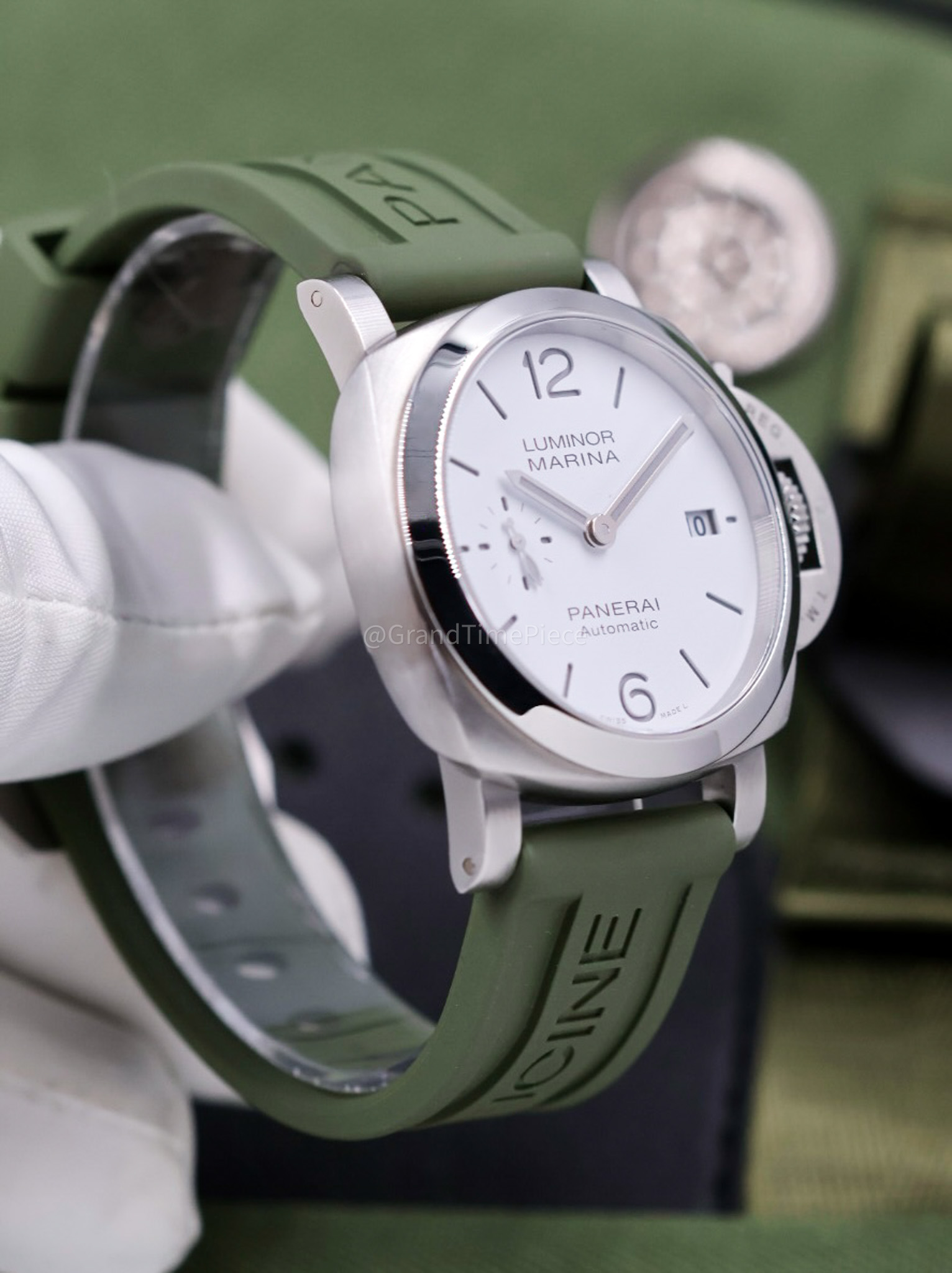 The Panerai Luminor Quaranta PAM01371 is a refined luxury watch that exemplifies the brand’s signature style and craftsmanship. Encased in a robust 40mm cushion-shaped stainless steel case, this timepiece is both elegant and durable, making it suitable for a variety of occasions. The watch features a fixed stainless steel bezel that complements its overall aesthetic, enhancing its contemporary design. One of the standout features of the PAM01371 is its striking white sun-brushed dial, which is not only visually appealing but also highly functional. This dial includes a date window positioned at the 3 o’clock mark and a small seconds sub-dial located at 9 o’clock, adding layers of usability to the watch.