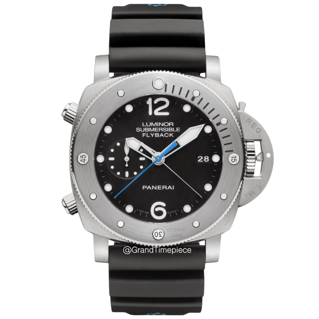 The Panerai Luminor Submersible 1950 3 Days Chrono Flyback, model PAM00614, is a bold professional dive chronograph distinguished by its substantial 47mm cushion-shaped case crafted from lightweight titanium. This material choice reduces the overall weight on the wrist while preserving strength and corrosion resistance, an important consideration for a watch intended for serious underwater use. The case exhibits the classic Luminor 1950 profile with its broad, sculpted surfaces and strong lugs, giving the watch a powerful presence while maintaining the vintage-inspired aesthetic that defines Panerai’s design language. Surrounding the dial is a titanium unidirectional revolving bezel with a clearly defined dive scale, engineered to allow precise timing of immersion periods while eliminating the risk of accidental rotation in the wrong direction, an essential safety feature for divers.