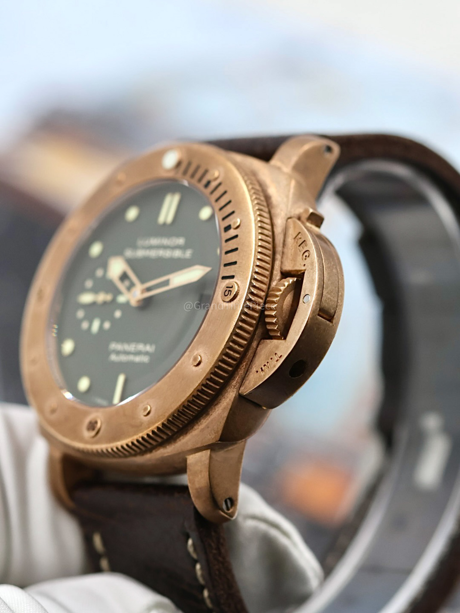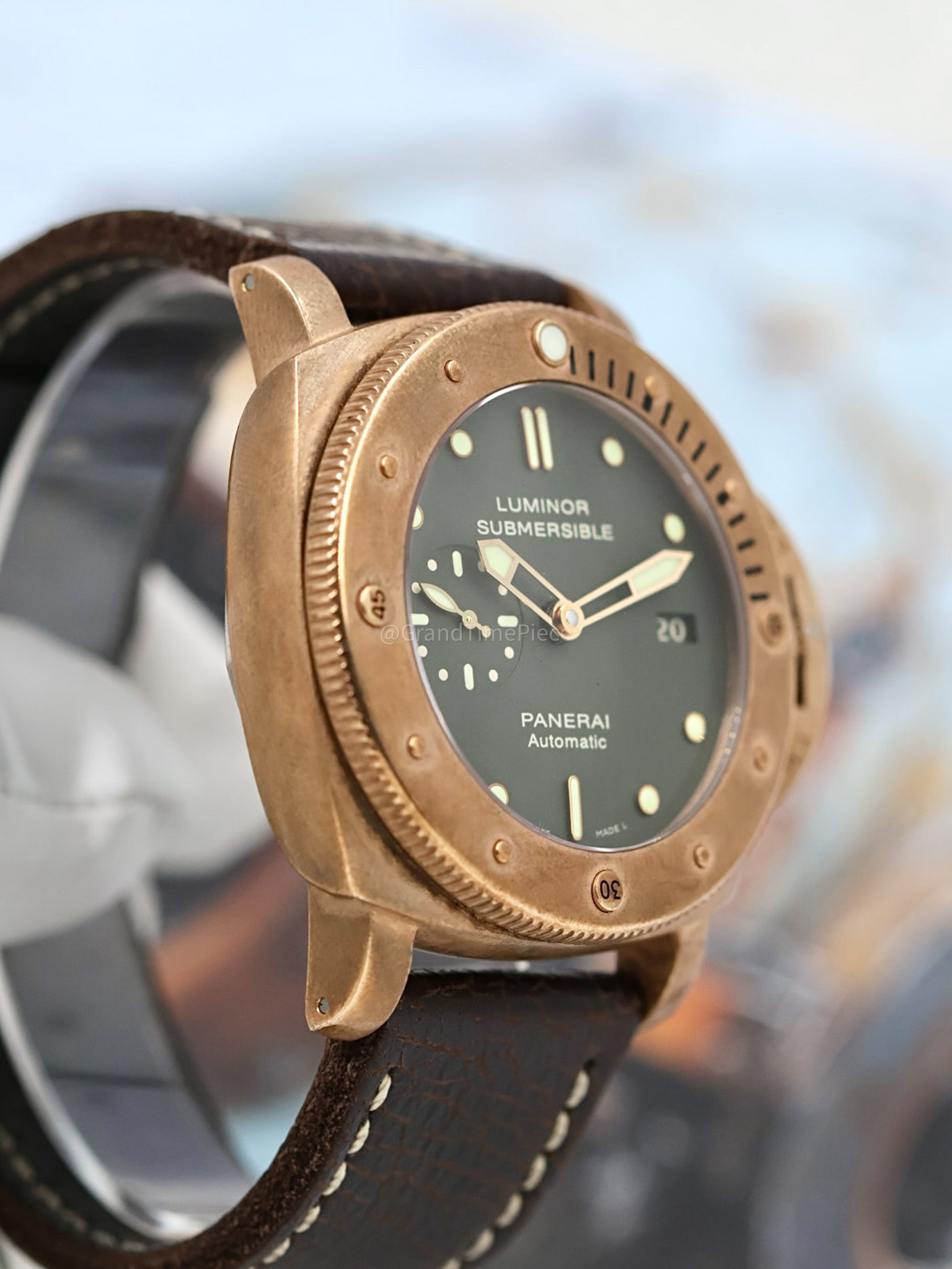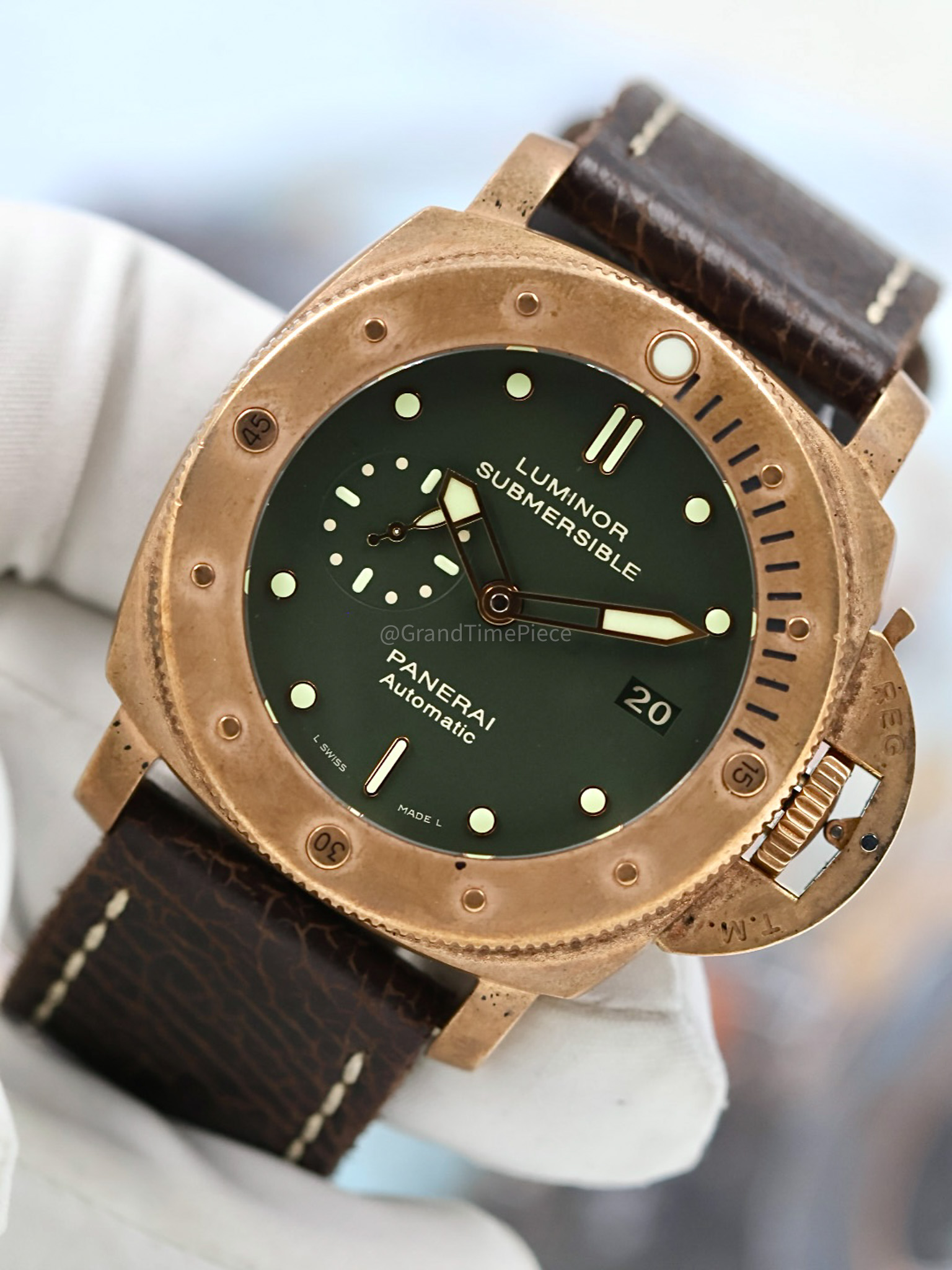 The Panerai Luminor Submersible 1950 Bronzo, model PAM00382, is a remarkable timepiece that epitomizes the brand’s dedication to craftsmanship and innovation. Launched as the first edition of bronze watches for Panerai, this limited edition piece is distinguished by its unique brushed bronze cushion-shaped case, measuring a robust 47mm in diameter. With only 1,000 units produced, it is a highly coveted item among collectors and enthusiasts, often regarded as a must-have for any serious Paneristi.