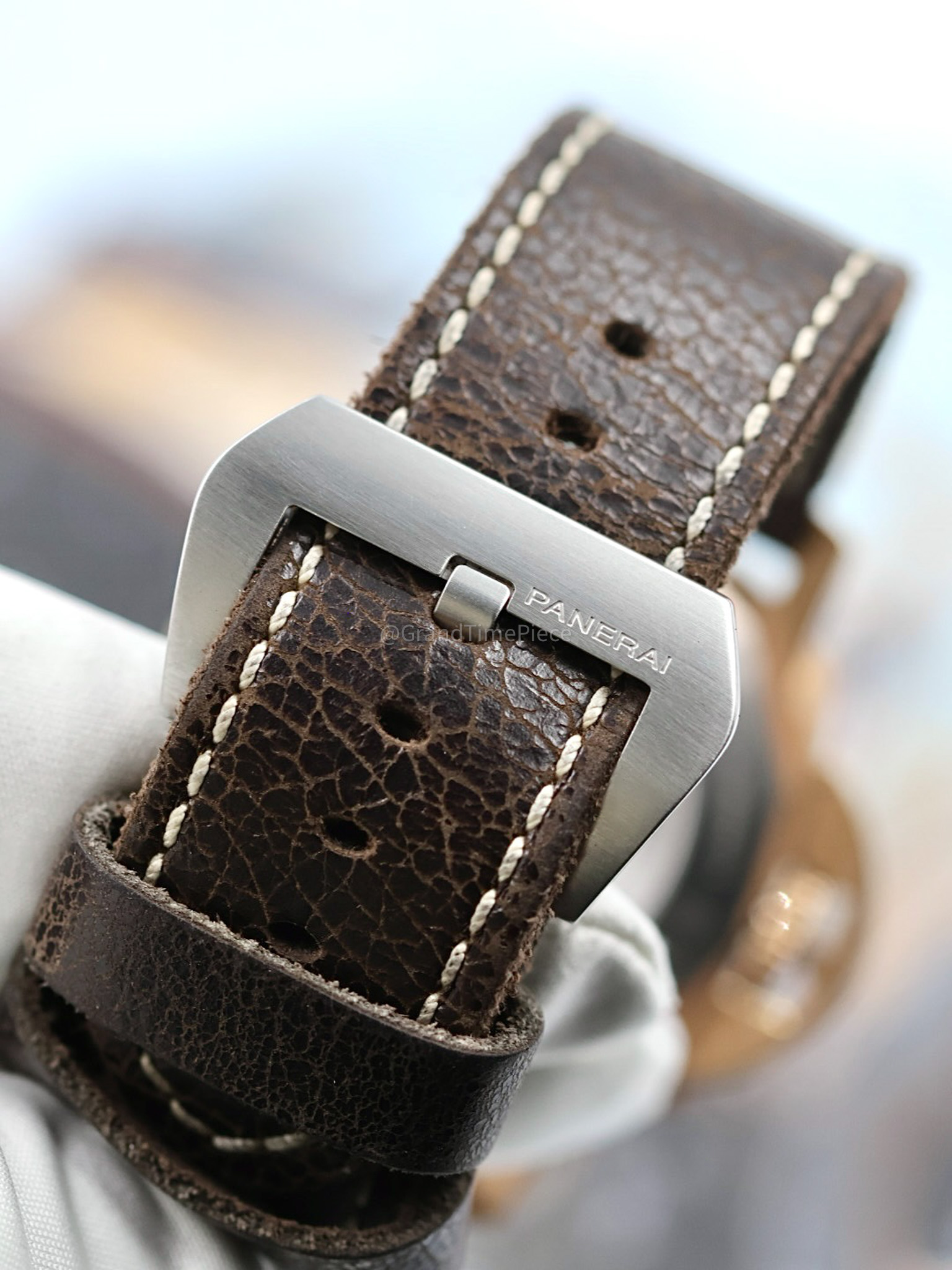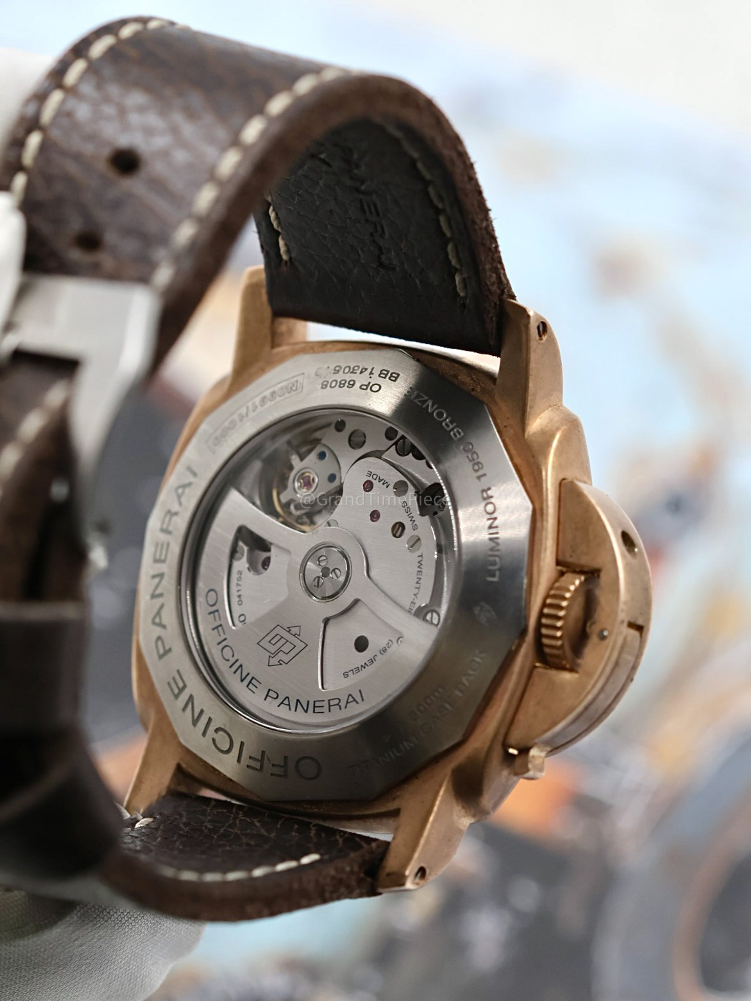 Additionally, the PAM00382 boasts a patented crown-protecting device with a locking lever, designed from the same brushed bronze, which adds both to its rugged character and functionality. The exhibition case back showcases the self-winding automatic movement—Panerai Calibre P.9000—offering an impressive power reserve of 72 hours. This watch is waterproof to depths of up to 300 meters, making it suitable not only for everyday wear but also for serious diving activities. It comes complete with an outer box, an inner box, a wooden box, and all relevant documentation, making it ideal for both wearers and collectors alike, ensuring its place as a prized possession in any watch collection.
