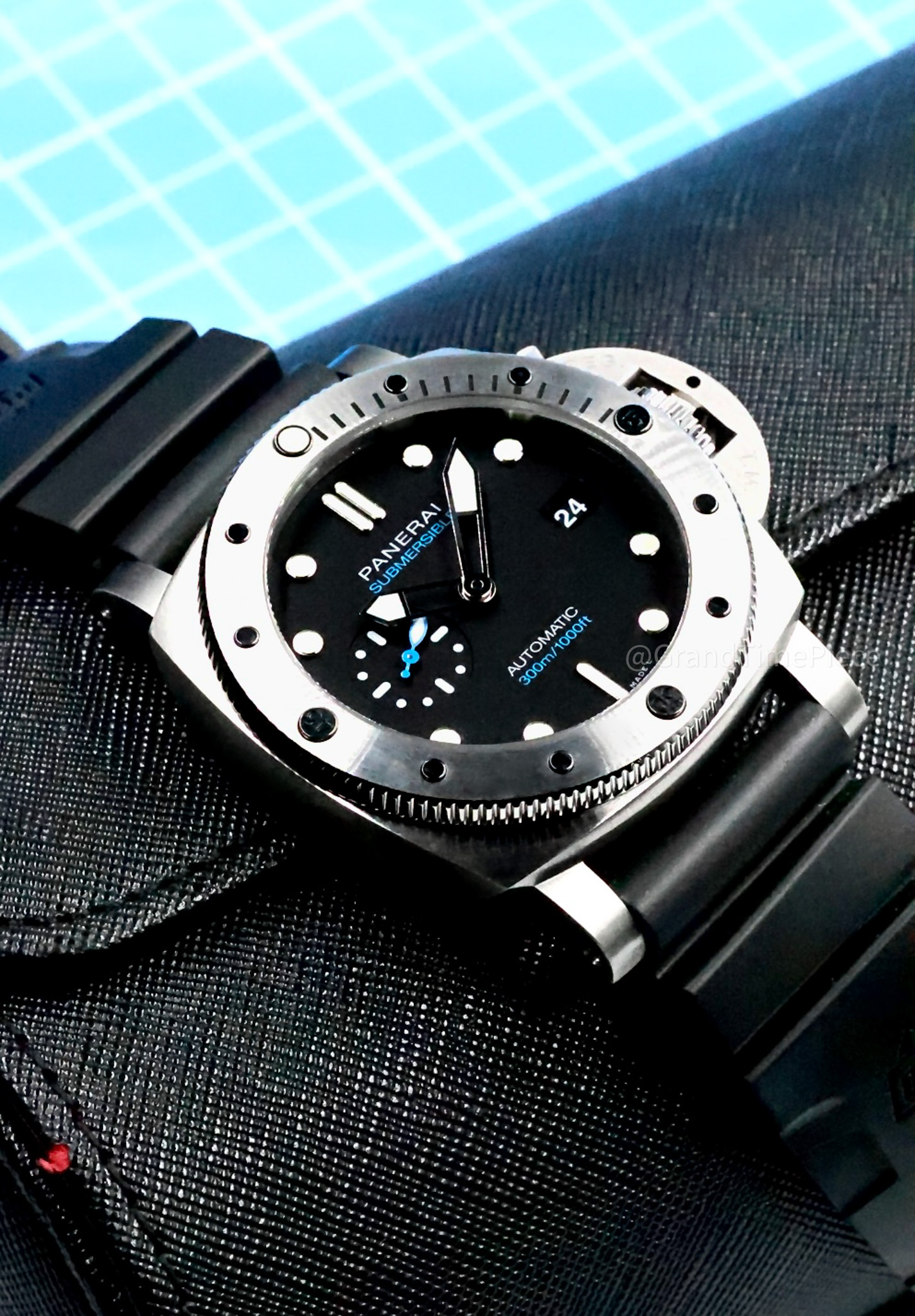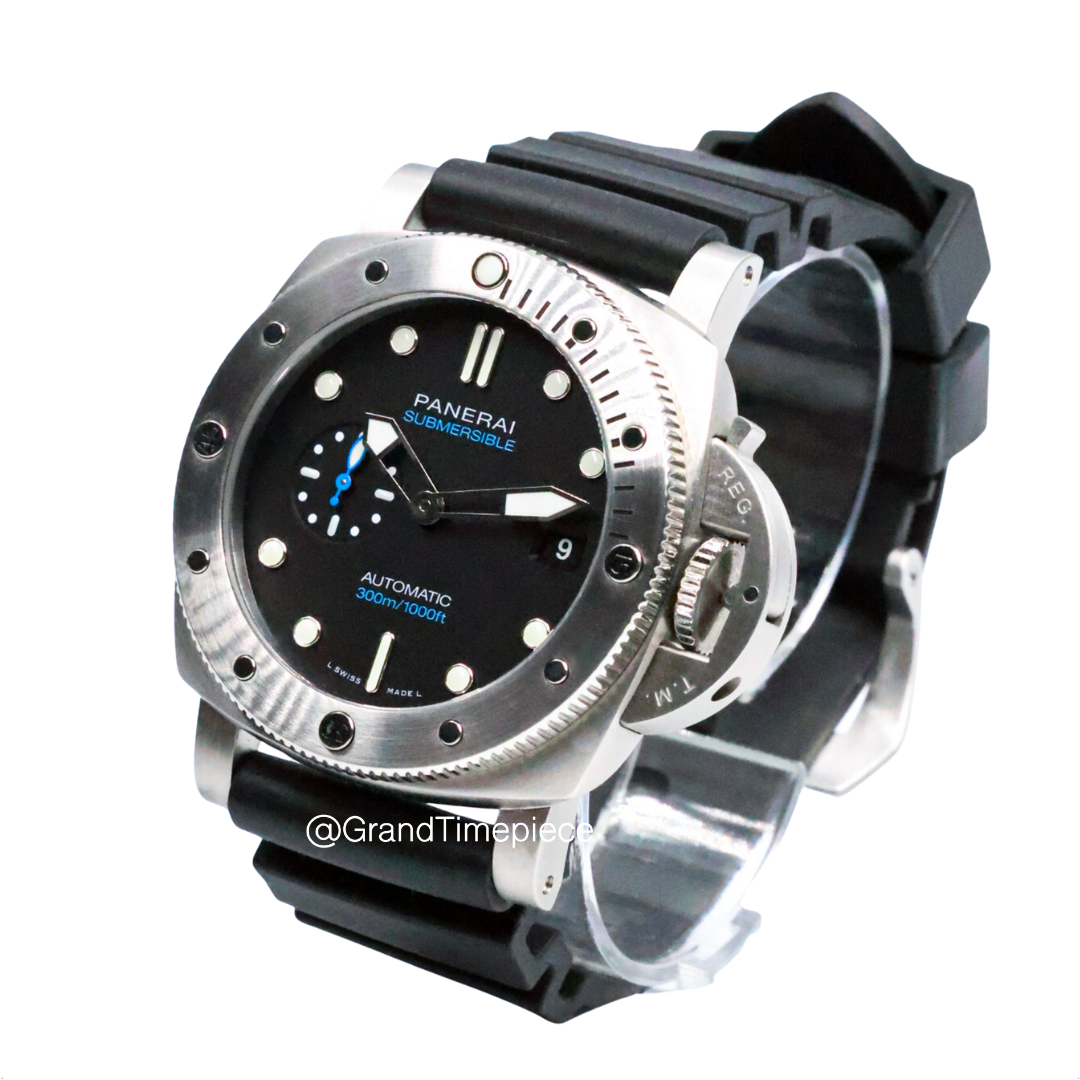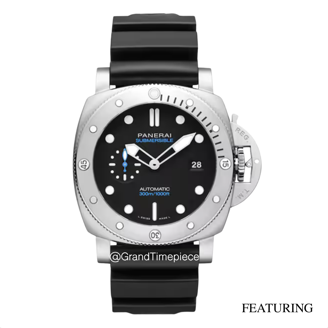 An interesting feature of this timepiece is the small-seconds hand positioned at the 9 o’clock mark, offering a unique asymmetrical aesthetic that distinguishes it from other models. The watch also boasts Panerai’s iconic patented crown protector, which not only safeguards the winding crown but also contributes to the watch’s bold character. A solid case back adds to its durability while housing the self-winding automatic movement, the Panerai Calibre P.900. This movement provides a power reserve of 72 hours, ensuring optimal performance for diving adventures and daily wear alike. Remarkably, the Submersible Quarantaquattro is waterproof up to 300 meters, making it an ideal companion for professional divers and watch enthusiasts who appreciate both style and rugged utility. Overall, this model embodies the essence of Panerai’s heritage in producing timepieces that are both aesthetically pleasing and robustly engineered for underwater exploration.