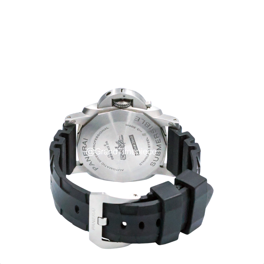 The Panerai Submersible Quarantaquattro, model PAM01229, exemplifies luxury and functionality in dive watch design. At the heart of its striking appearance is a robust cushion-shaped stainless steel case that measures 44.0 mm in diameter, providing a bold yet elegant silhouette. The watch is complemented by a black rubber strap, which is both durable and comfortable, encapsulating Panerai’s dedication to performance. The unidirectional stainless steel bezel enhances its functionality, allowing precise tracking of dive times, while the black dial features luminous hour markers that ensure visibility even in low-light underwater conditions. Protecting the dial is a domed sapphire crystal, known for its scratch resistance and clarity.
