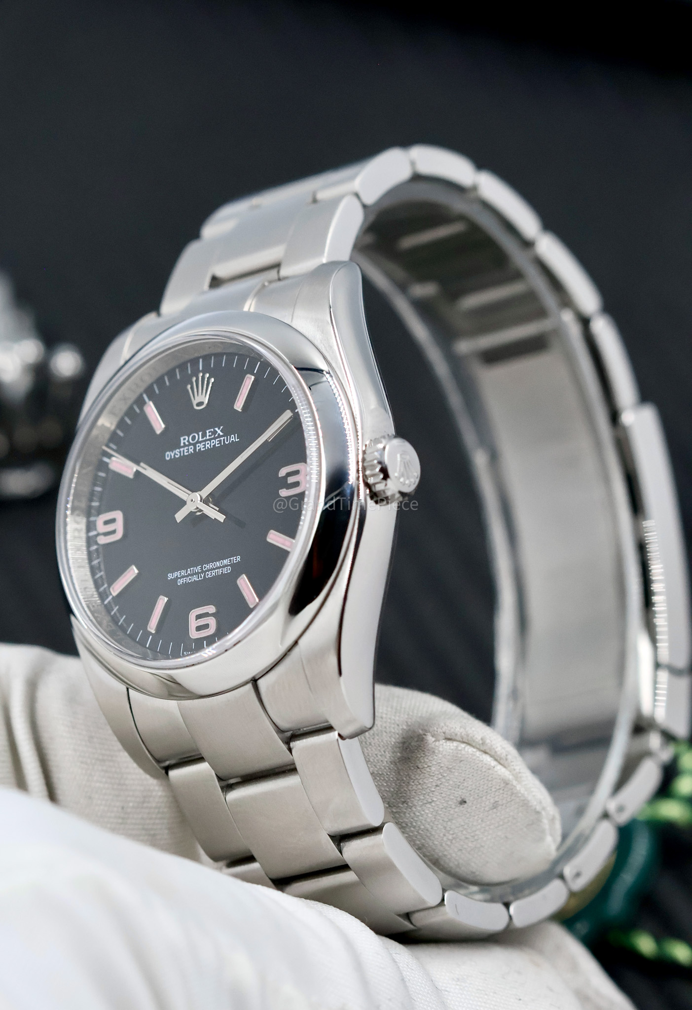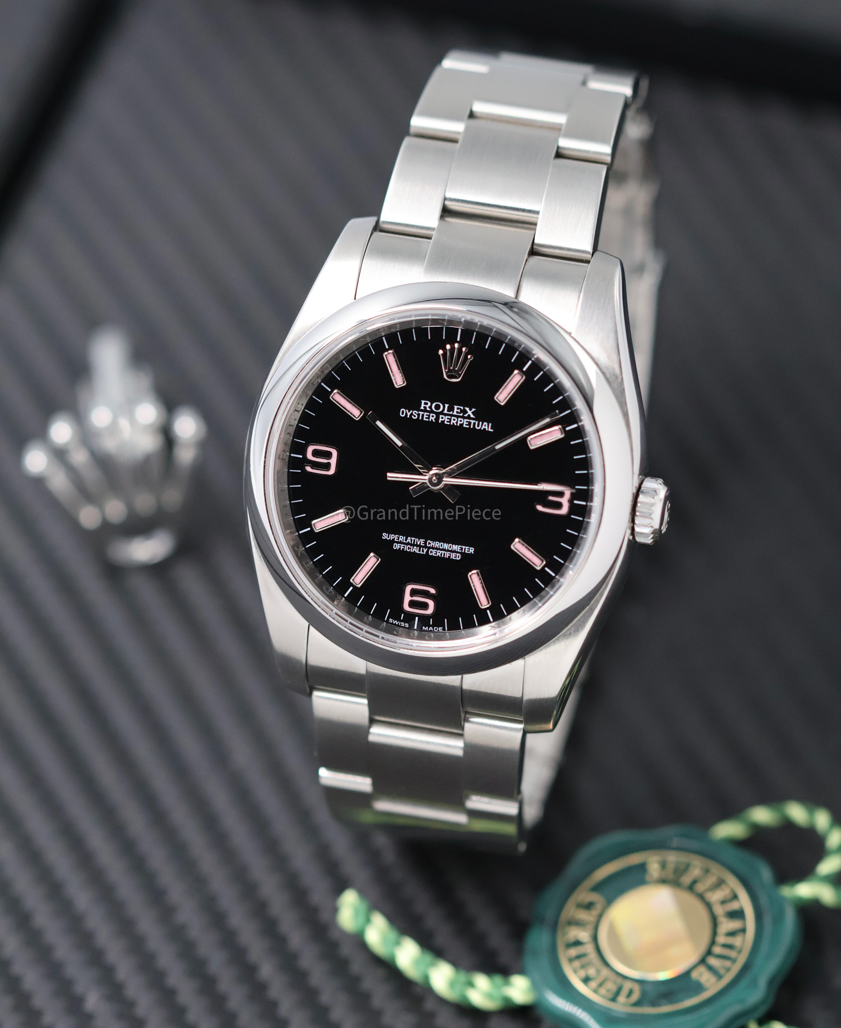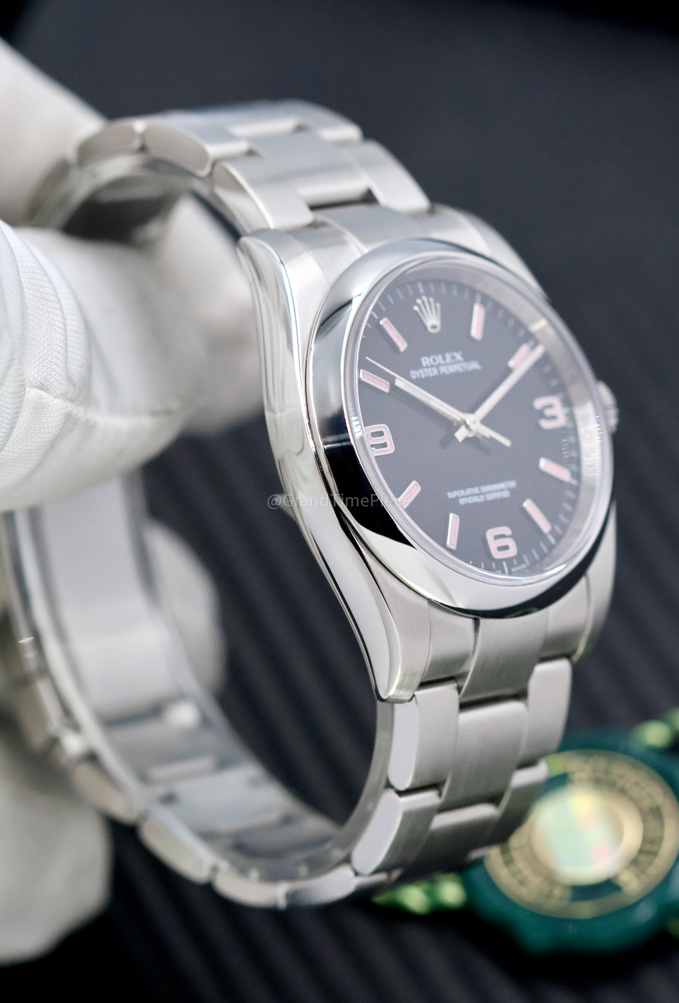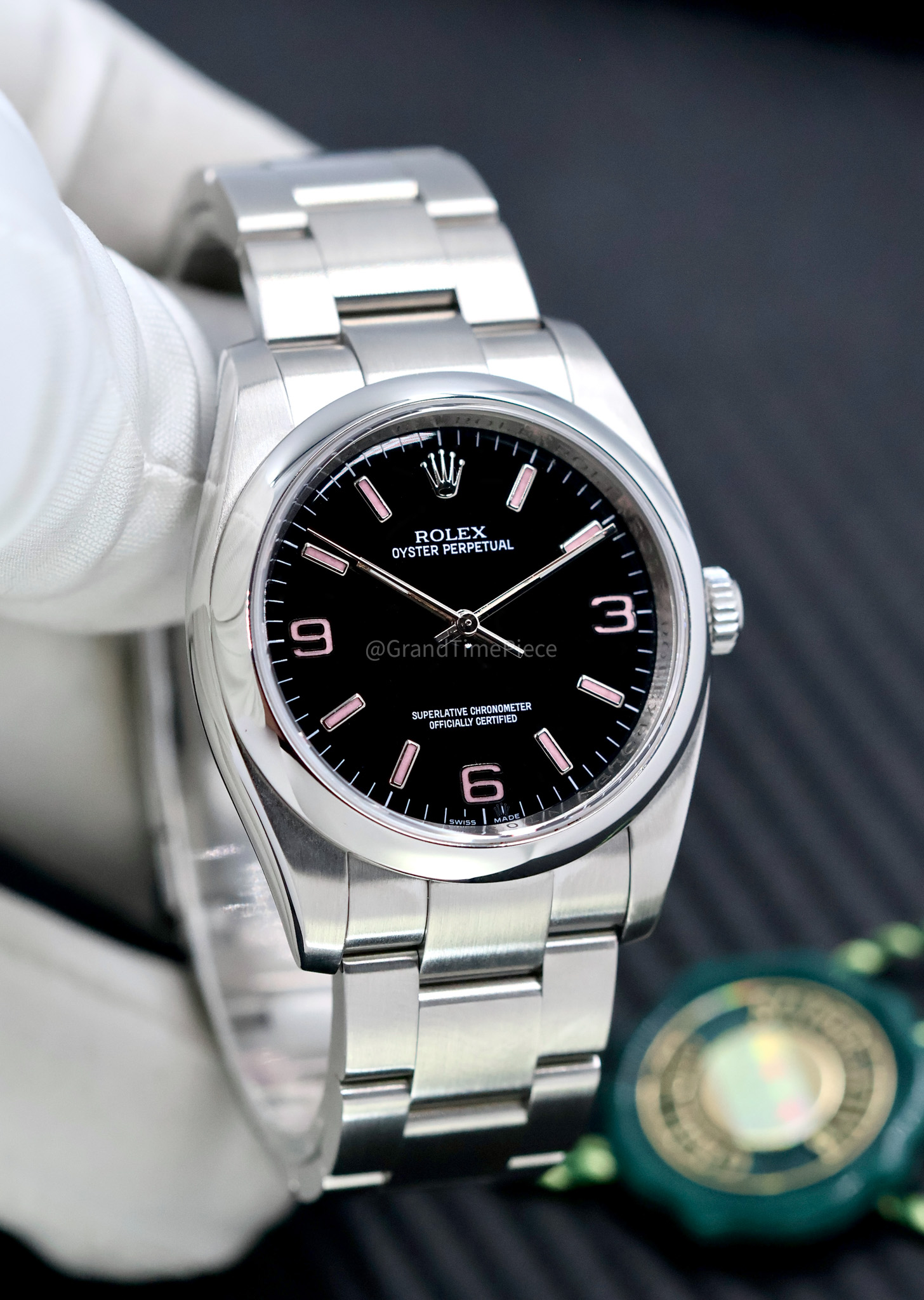 The distinctive black dial of the 116000 is accentuated by Arabic numerals positioned at 3, 6, and 9 o’clock, which evoke a sense of adventure reminiscent of the Rolex Explorer. This model’s uniqueness is amplified by rare variations, such as the “Pink Explorer,” which showcases pink numerals that have captivated collectors. The domed sapphire crystal provides a clear view of the dial while ensuring scratch resistance, making it suitable for daily wear.