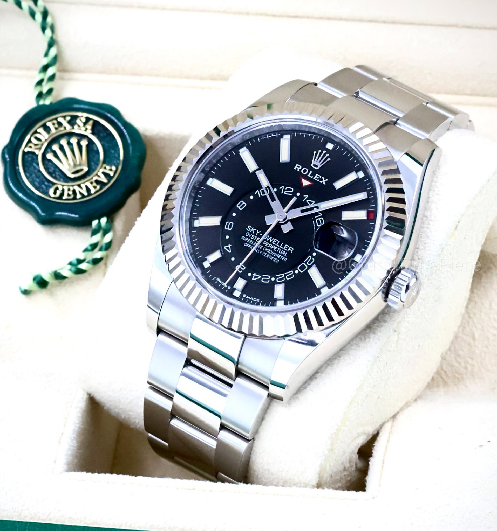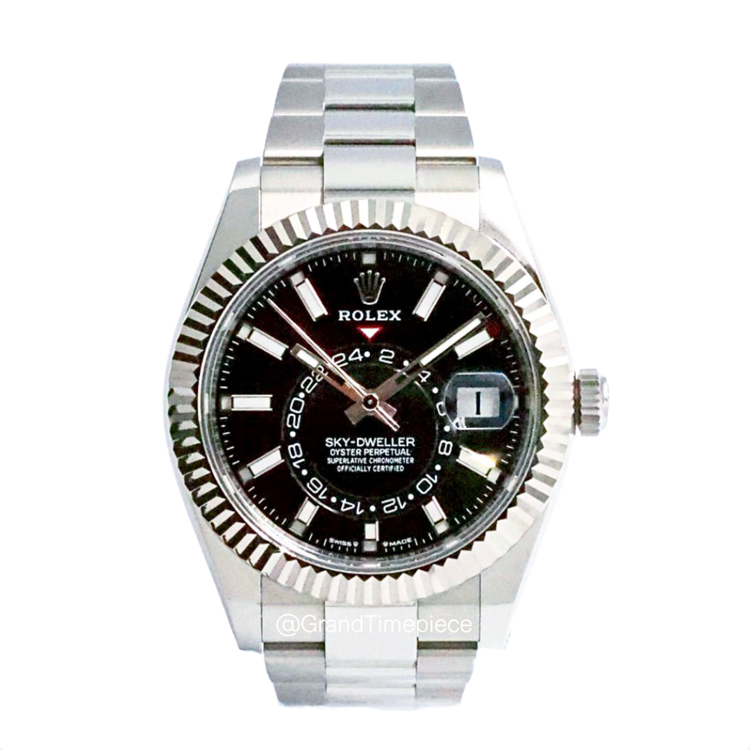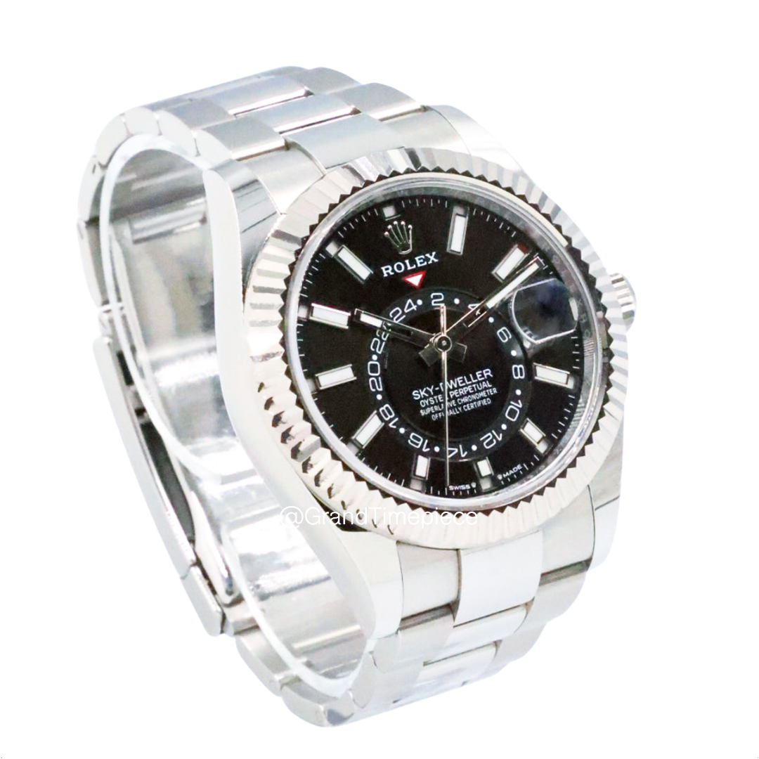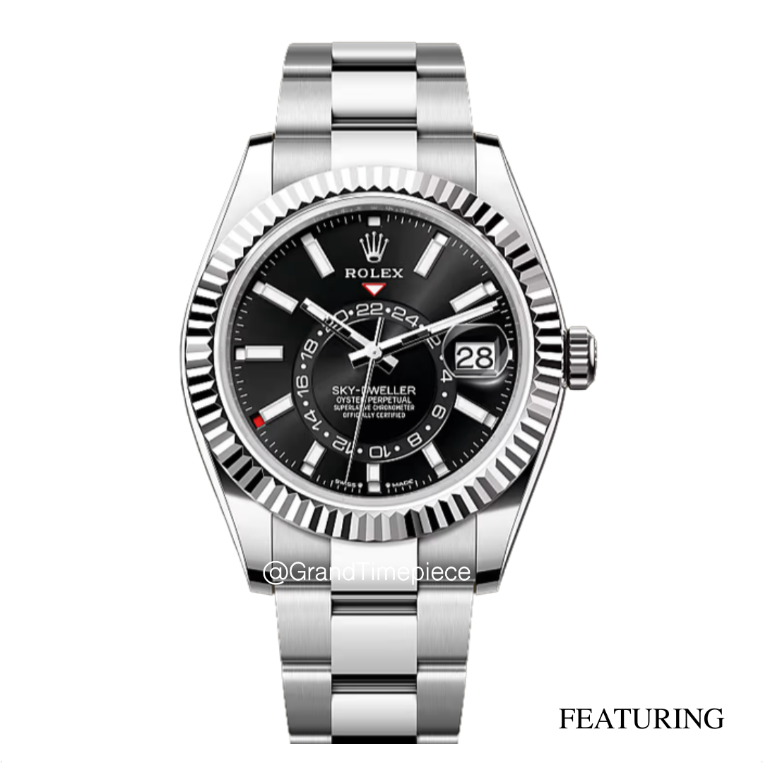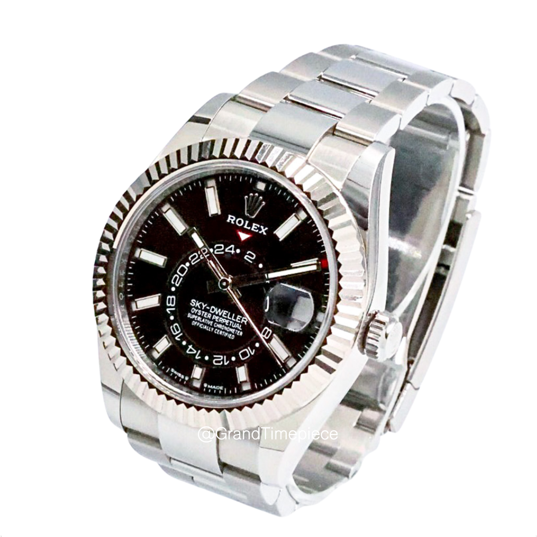 The Rolex Sky-Dweller model 336934 is a masterful blend of innovation and elegance, firmly establishing itself as a standout piece in Rolex’s prestigious collection. This timepiece features a polished Oystersteel case that measures 42.0 mm in diameter, designed to withstand daily wear while maintaining its striking appearance. The Oystersteel finish not only provides a brilliant shine but also adds to the watch’s durability, ensuring that it remains a reliable companion for years to come. Completing the case is the iconic 18ct white gold fluted bezel, which not only enhances the watch’s aesthetic appeal but also plays a crucial role in its functionality through the innovative Ring Command system.