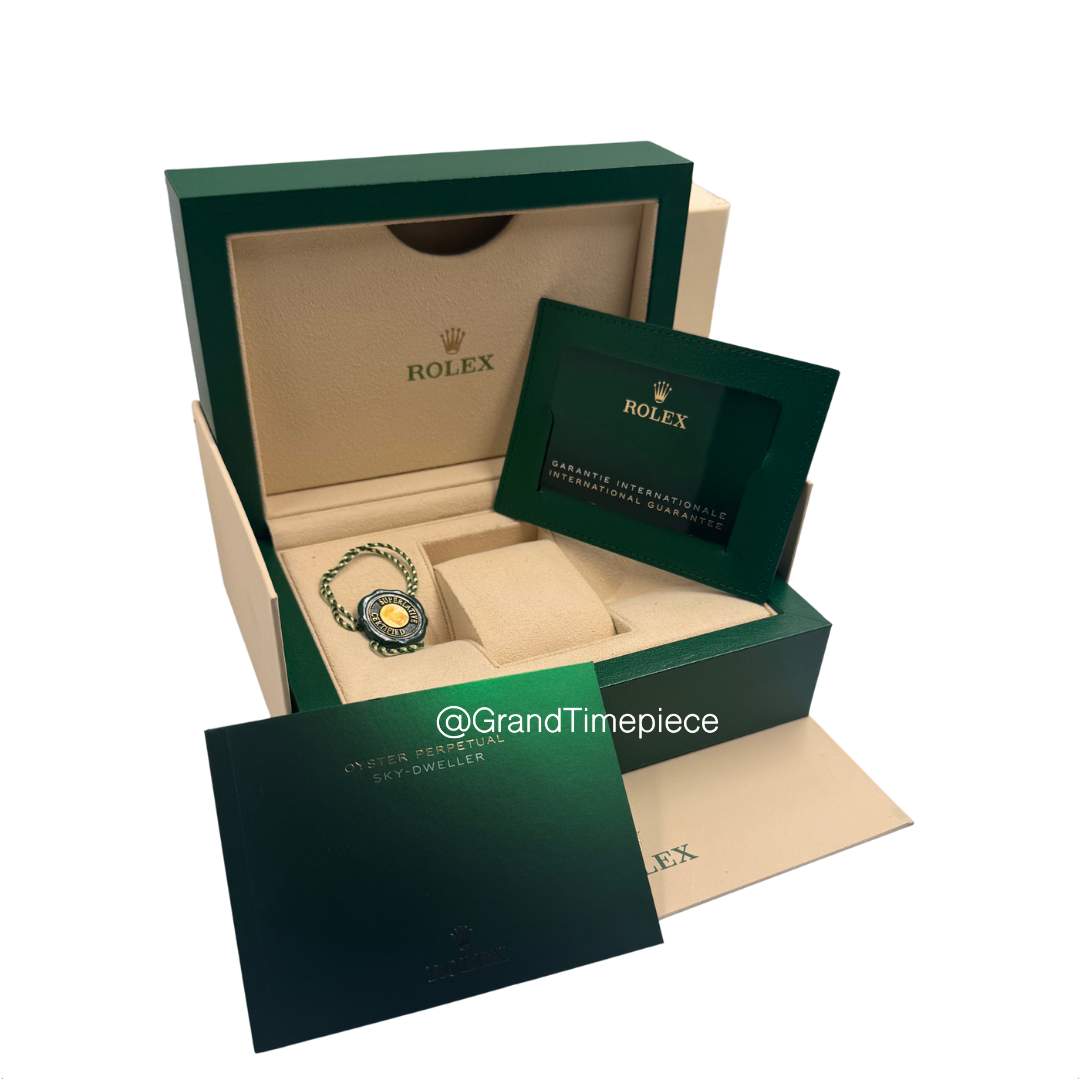 The watch is protected by a scratch-resistant sapphire crystal, along with a Cyclops lens that magnifies the date for easy reading. Its screw-down crown features the Twinlock double waterproofness system, ensuring maximum water resistance, while the solid case back provides additional protection. The heart of the Rolex Sky-Dweller is powered by a self-winding automatic movement, specifically the Rolex caliber 9002. This movement is engineered for precision and reliability, offering a substantial power reserve of 72 hours, which allows the watch to maintain its functionality even during periods of inactivity. With a waterproof rating of up to 100 meters, the Sky-Dweller is equipped for a variety of environments, making it a versatile choice for both adventurers and those who appreciate a refined timepiece. The Rolex Sky-Dweller model 336934 thus serves as a perfect fusion of luxury, practicality, and cutting-edge technology, establishing itself as an essential accessory for the modern traveler.