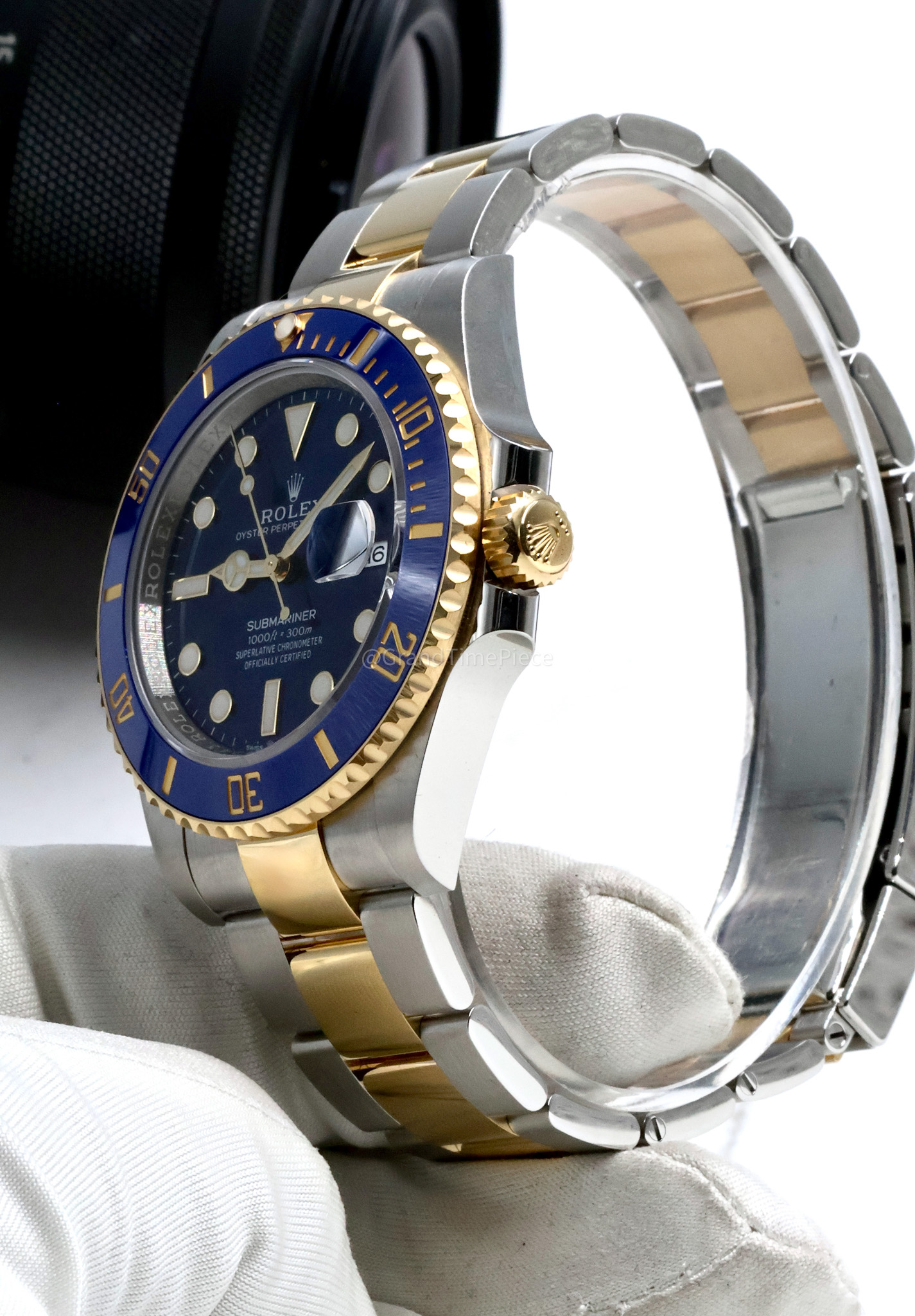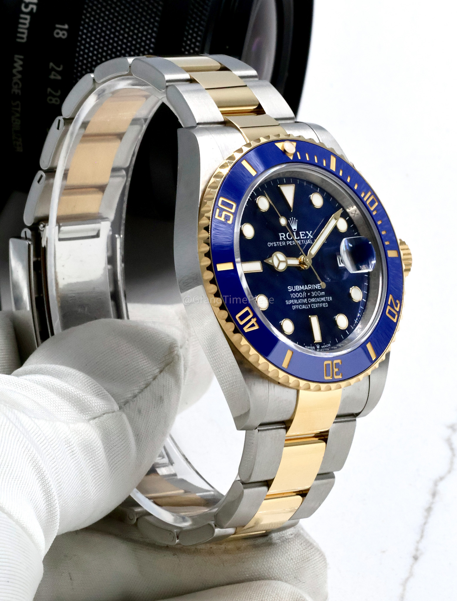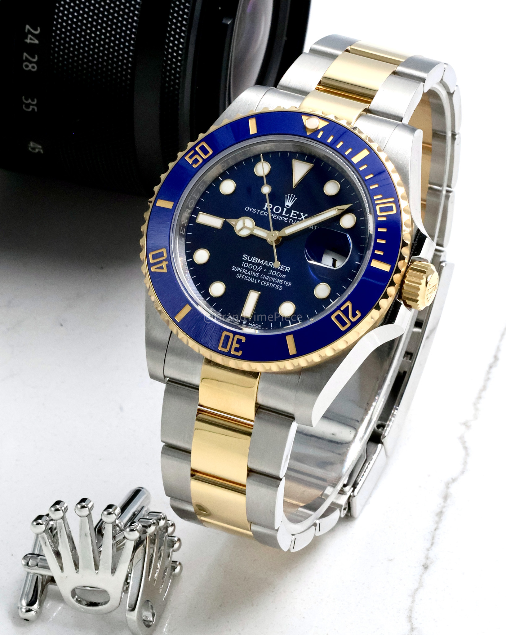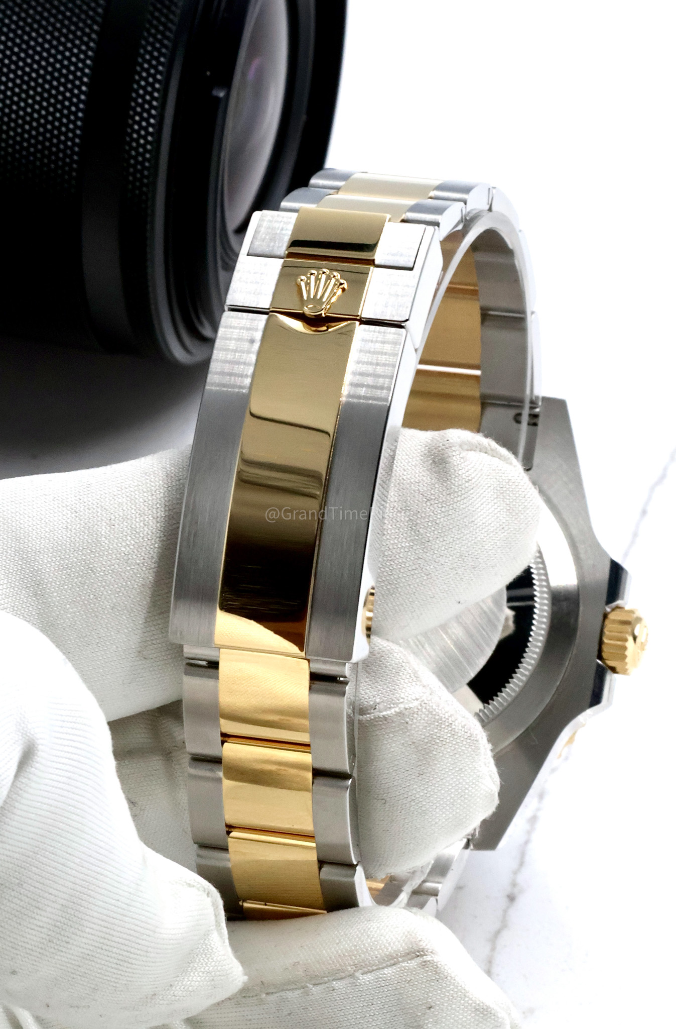 The Rolex Oyster Perpetual Submariner model 126613LB, affectionately known among enthusiasts as the “Bluesy,” epitomizes the perfect fusion of luxury and functionality in a diving watch. Crafted with a robust Oystersteel case, the watch boasts a diameter of 41mm, striking a remarkable balance between elegance and resilience. Its unidirectional rotatable bezel features a stunning blue Cerachrom insert, marked with gold-coated numerals, which not only enhances its visual appeal but also serves a practical purpose for timing dives. The two-tone Oyster bracelet, a hallmark of this model, is both sophisticated and practical, equipped with the Oysterlock safety clasp and the innovative Glidelock extension system, allowing wearers to adjust it easily without tools over a wetsuit.