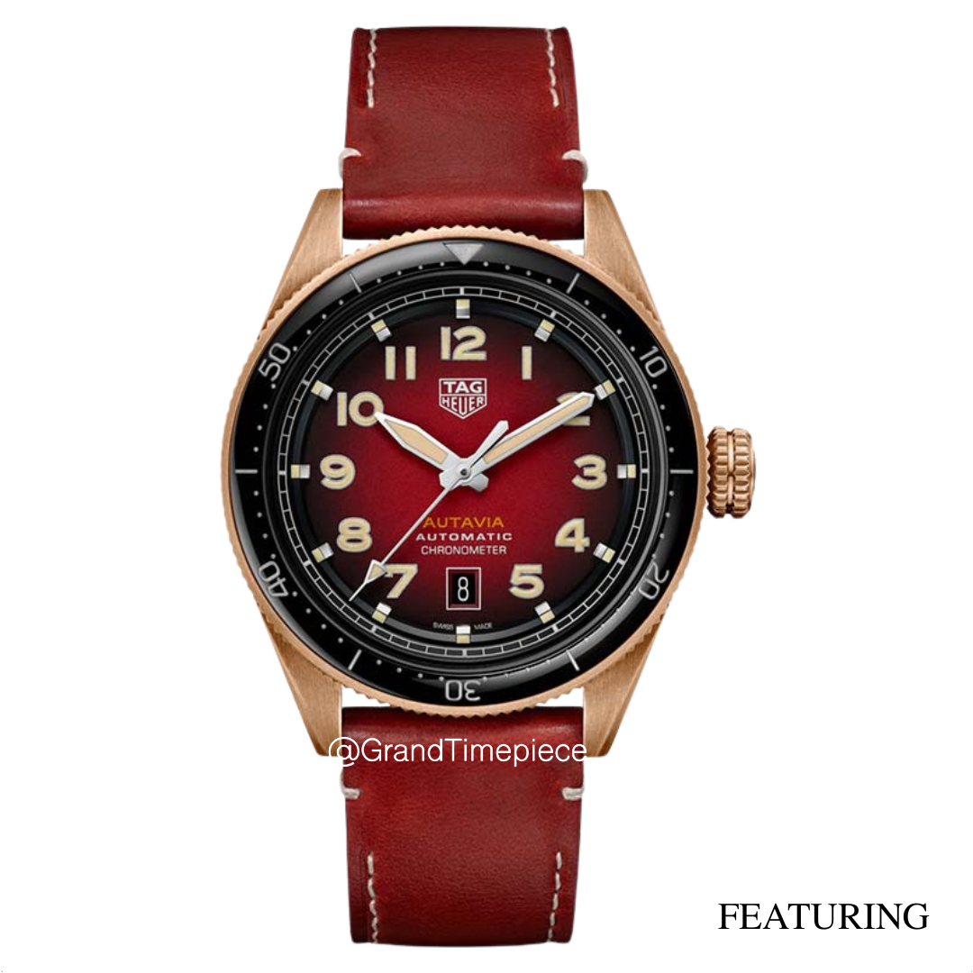 The TAG Heuer Autavia Cal.5, model WBE5192.FC8300, is a sophisticated timepiece that embodies the brand’s commitment to precision and luxury. At the heart of this watch is its striking 42mm round case, meticulously crafted from bronze with a fine-brushed finish that enhances its rugged yet elegant character. This model features a striking red calf leather strap, which is comfortably secured with a pin buckle, ensuring a snug fit on the wrist. The turning bezel is a standout element, combining bronze and ceramic to create a dynamic visual contrast and add functionality.