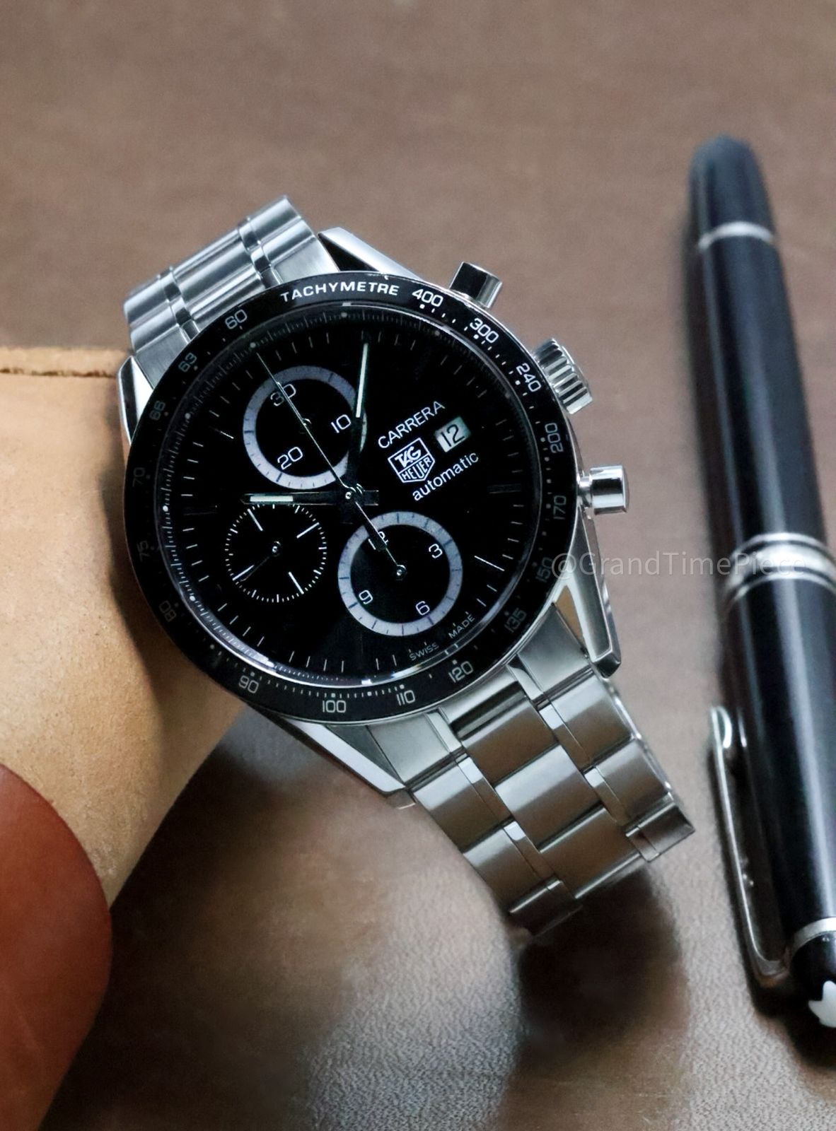 At the heart of this timepiece lies a black dial, characterized by luminous hands and raised index hour markers that ensure readability in various lighting conditions. Surrounding the dial are minute markers that facilitate precise timekeeping, while a date window located at the 3 o’clock position adds to the watch’s practicality. The Carrera Cal.16 also boasts three chronograph sub-dials, which measure 60 seconds, 30 minutes, and 12 hours, providing multifaceted functionality for timing events.