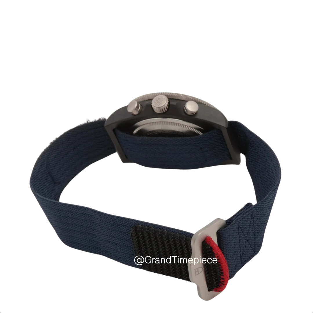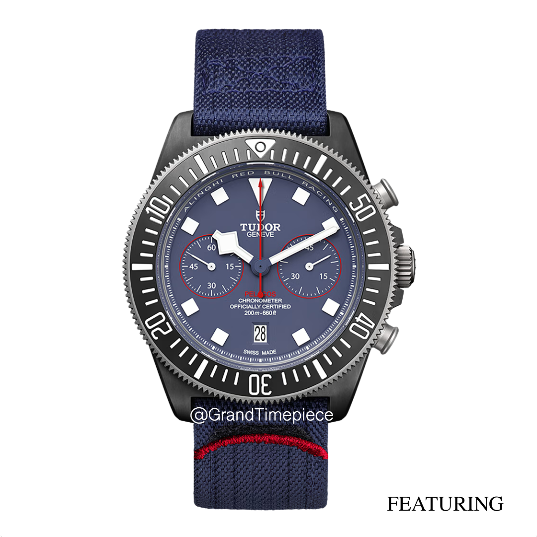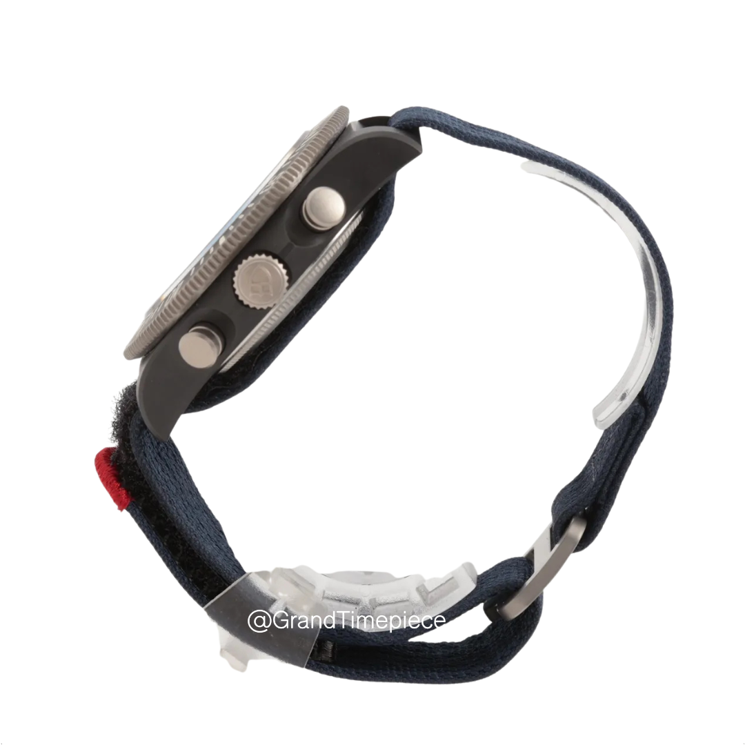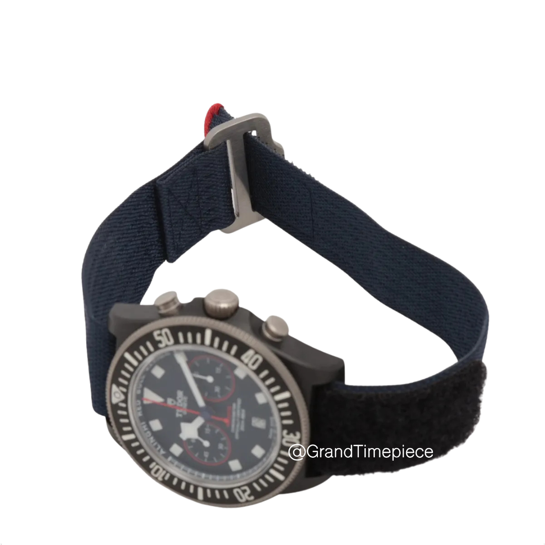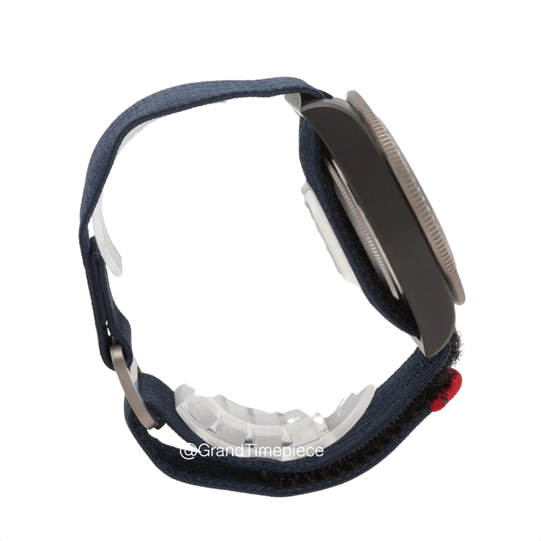 The Alinghi Red Bull Racing logo engraved on the case back symbolizes the collaboration between Tudor and the renowned racing team, adding a unique flair for collectors and enthusiasts. Driven by the self-winding automatic Tudor Calibre MT5813 movement, the watch offers an impressive power reserve of 70 hours, making it suitable for both racing and everyday wear. With a water resistance of up to 200 meters, the Tudor FXD Chrono is engineered to withstand demanding environments, making it a perfect companion for adventurers and sports aficionados alike. The blue fabric strap, equipped with a self-gripping fastening system, ensures comfort and security, rounding out a timepiece that merges sportiness with luxury in a distinctive package.