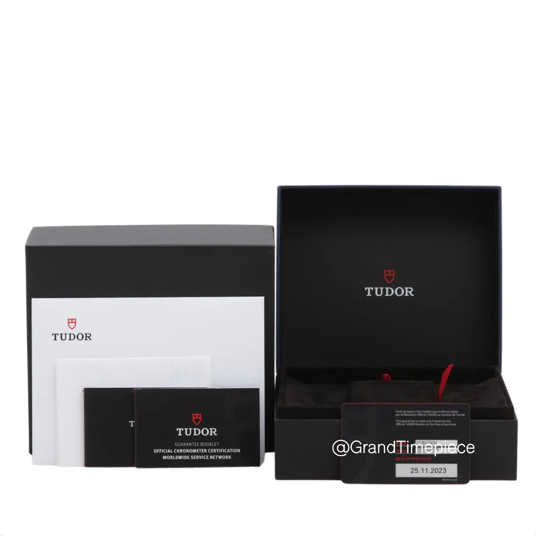 The matte blue dial serves as a striking canvas, adorned with red accents that highlight the chronograph counters, enhancing visibility and legibility. A domed scratch-resistant sapphire crystal protects the dial, ensuring clarity and resilience against everyday wear. The titanium screw-down crown, featuring the iconic TUDOR shield in relief, reinforces the watch’s professional design and adds a touch of elegance.